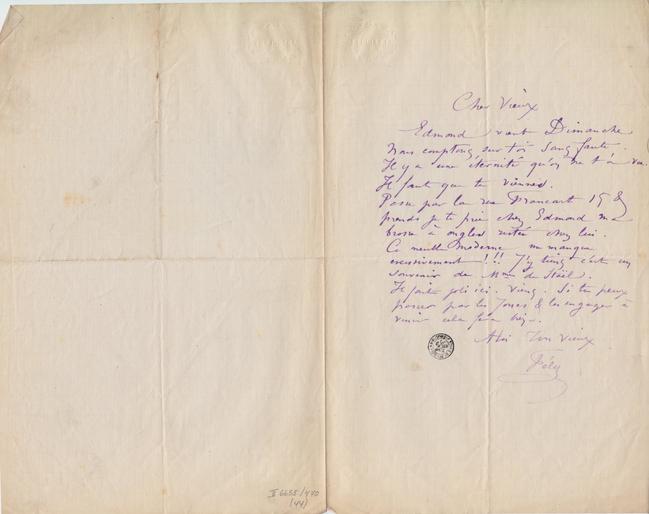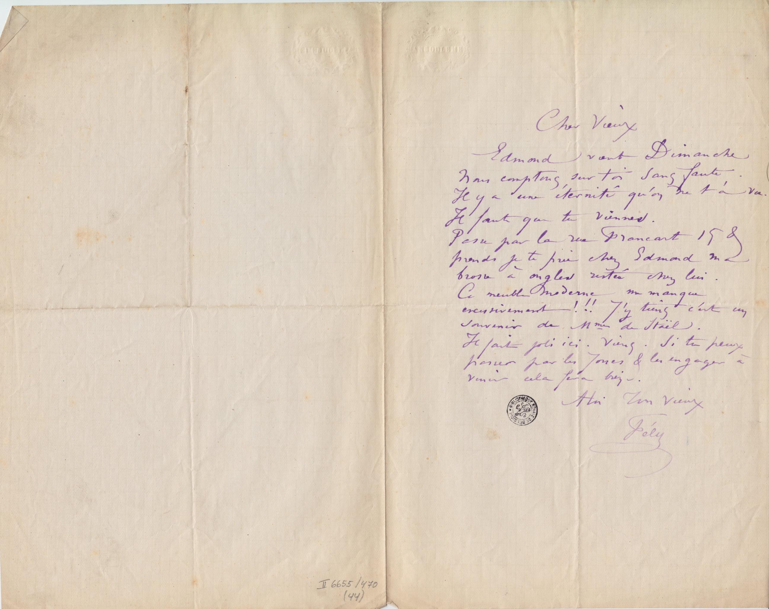 Écrite en Plume Violet. En-tête: Cachet sec "ANGOULEME".