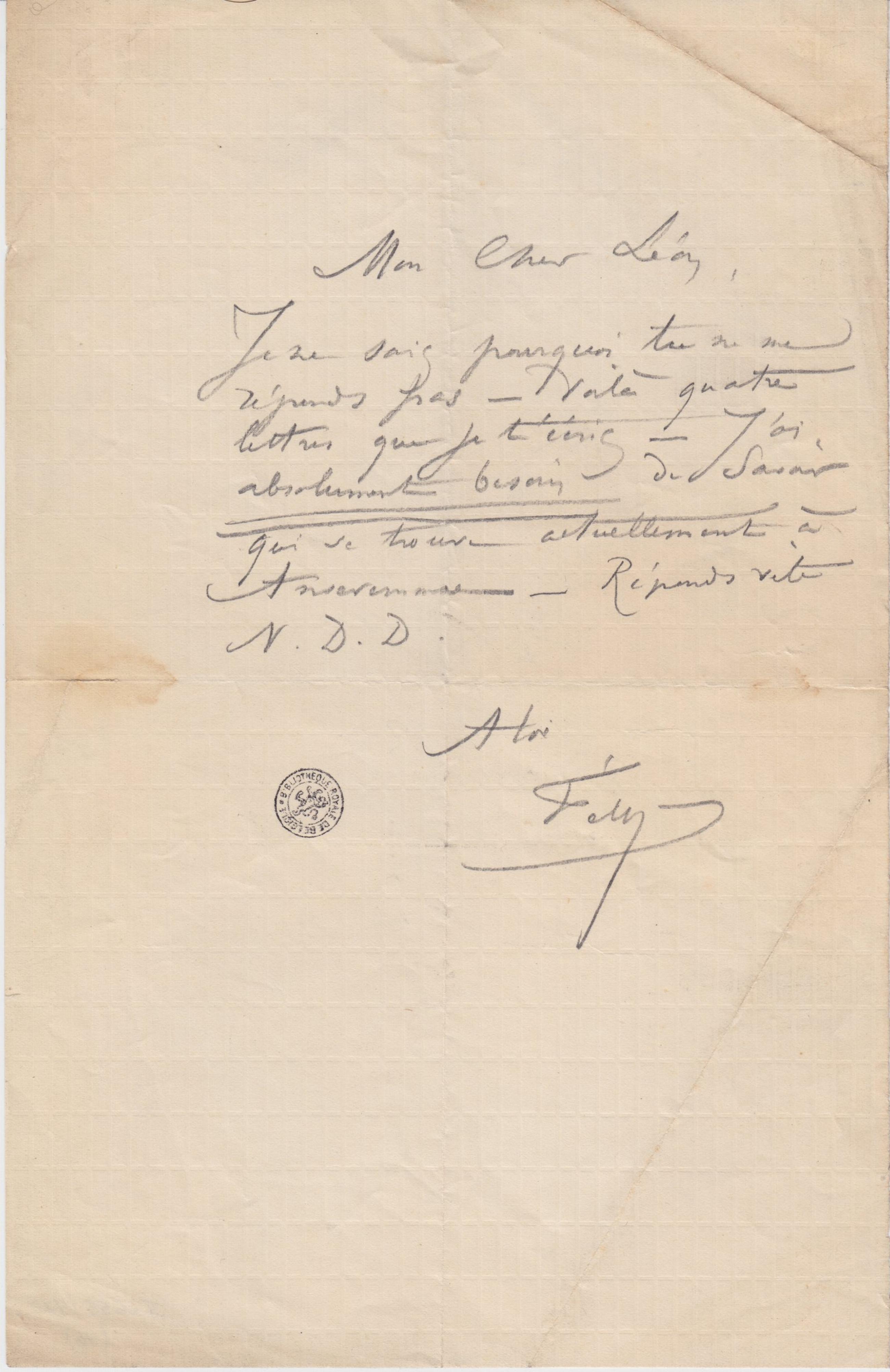 Je ne sais pourquoi tu ne me réponds pas – Voilà quatre lettres que je t’écris – J’ai absolument besoin de savoir qui se trouve actuellement à Anseremme – Réponds vite N. D. D.