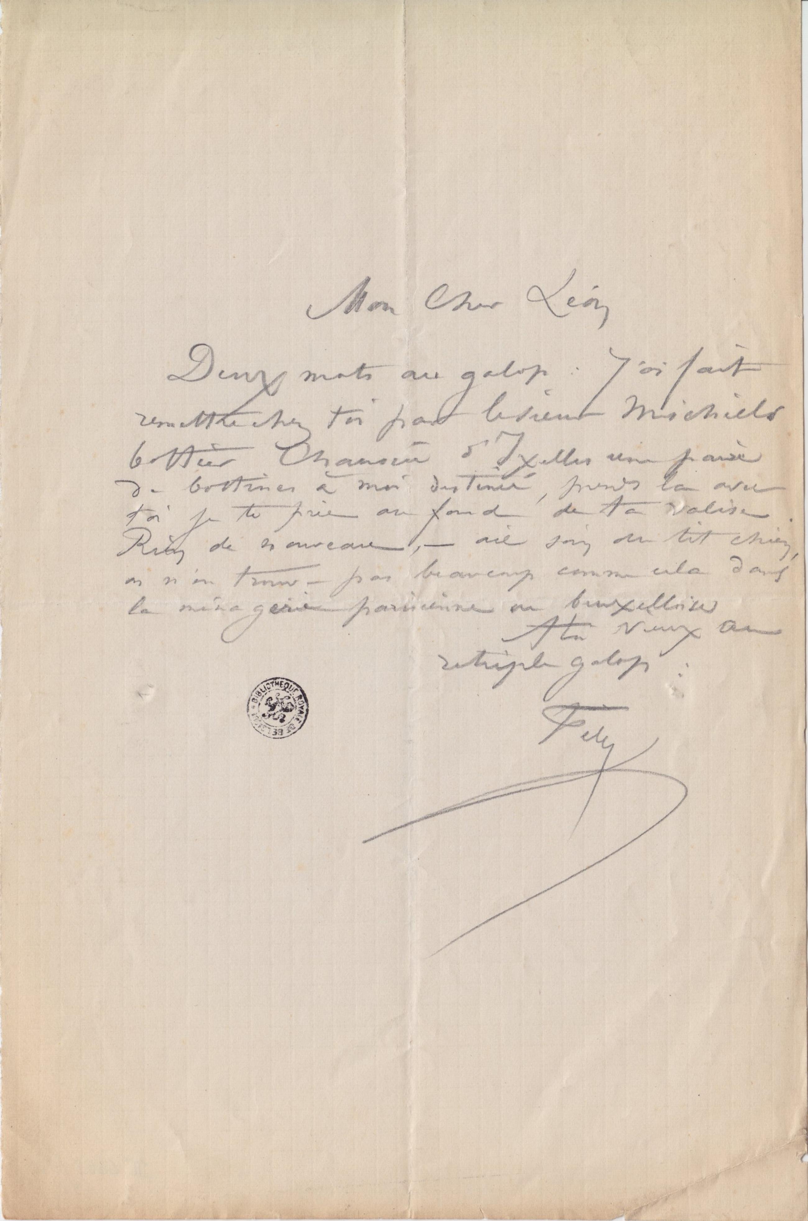 Deux mots au galop : J’ai fait remettre chez toi par le sieur Michiels bottier Chaussée d’Ixelles une paire de bottines à moi destinée, prends la avec toi je te prie au fond de ta valise.
