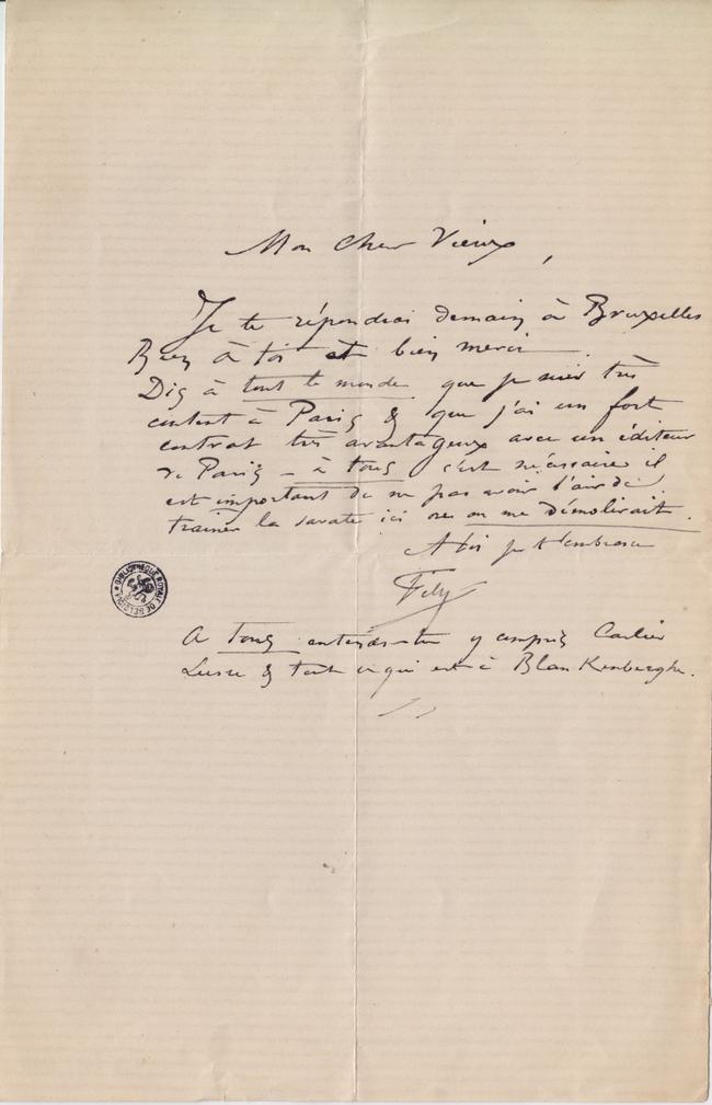 Bien à toi et bien merci. Dis à tout le monde que je suis très content à Paris & que j’ai un fort contrat très avantageux avec un éditeur de Paris – à tous c’est nécessaire il est important de ne pas avoir l’air de traîner la savate ici ou on me démolirait.
