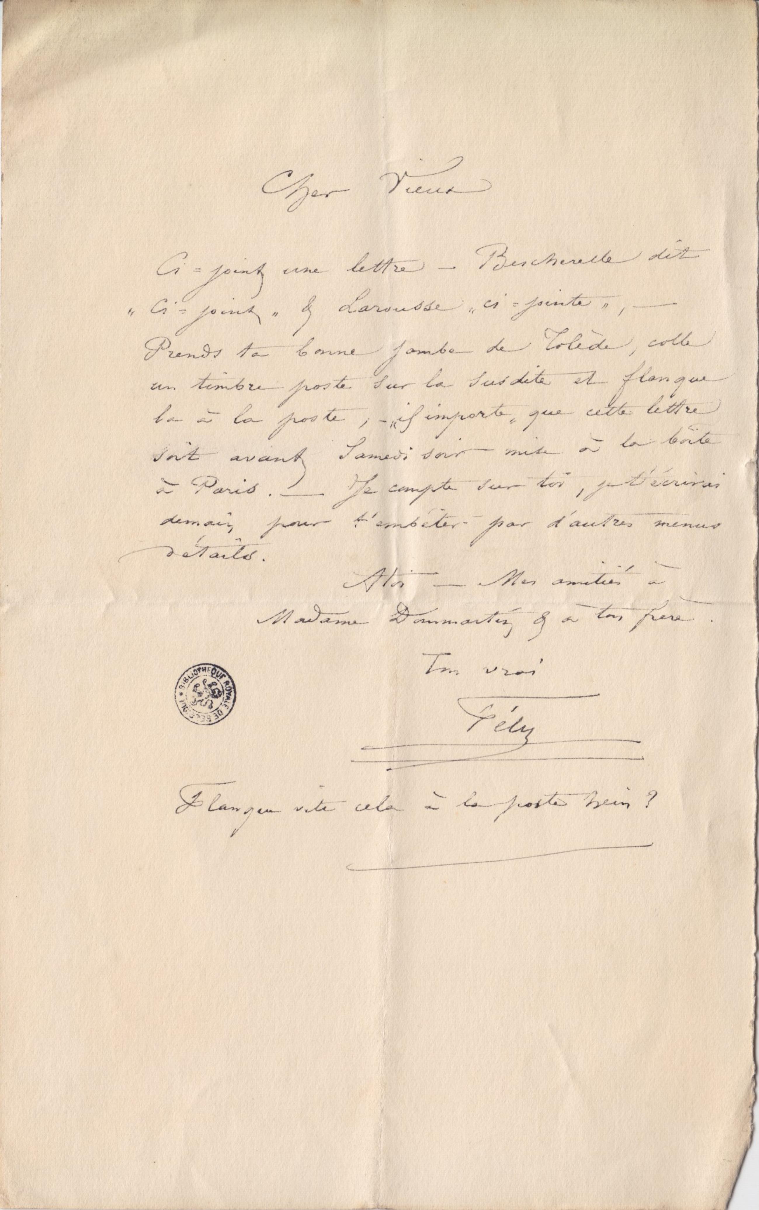 Ci-joint une lettre – Bescherelle dit « ci-joint » & Larousse « ci-jointe », – Prends ta bonne jambe de Tolède, colle un timbre poste sur la susdite et flanque la à la poste, – « il importe » que cette lettre soit avant Samedi soir mise à la boite à Paris. – Je compte sur toi, je t’écrirai demain pour t’embêter par d’autres menus détails.