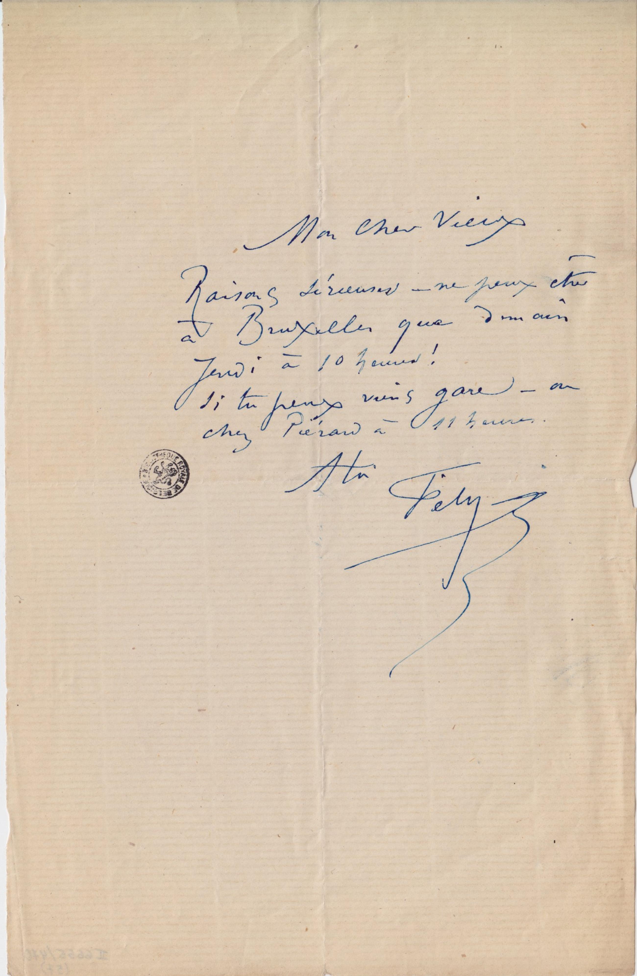 Raisons sérieuses – ne peux être à Bruxelles que demain Jeudi à 10 heures ! Si tu peux viens gare – ou chez Piérard à 11 heures.