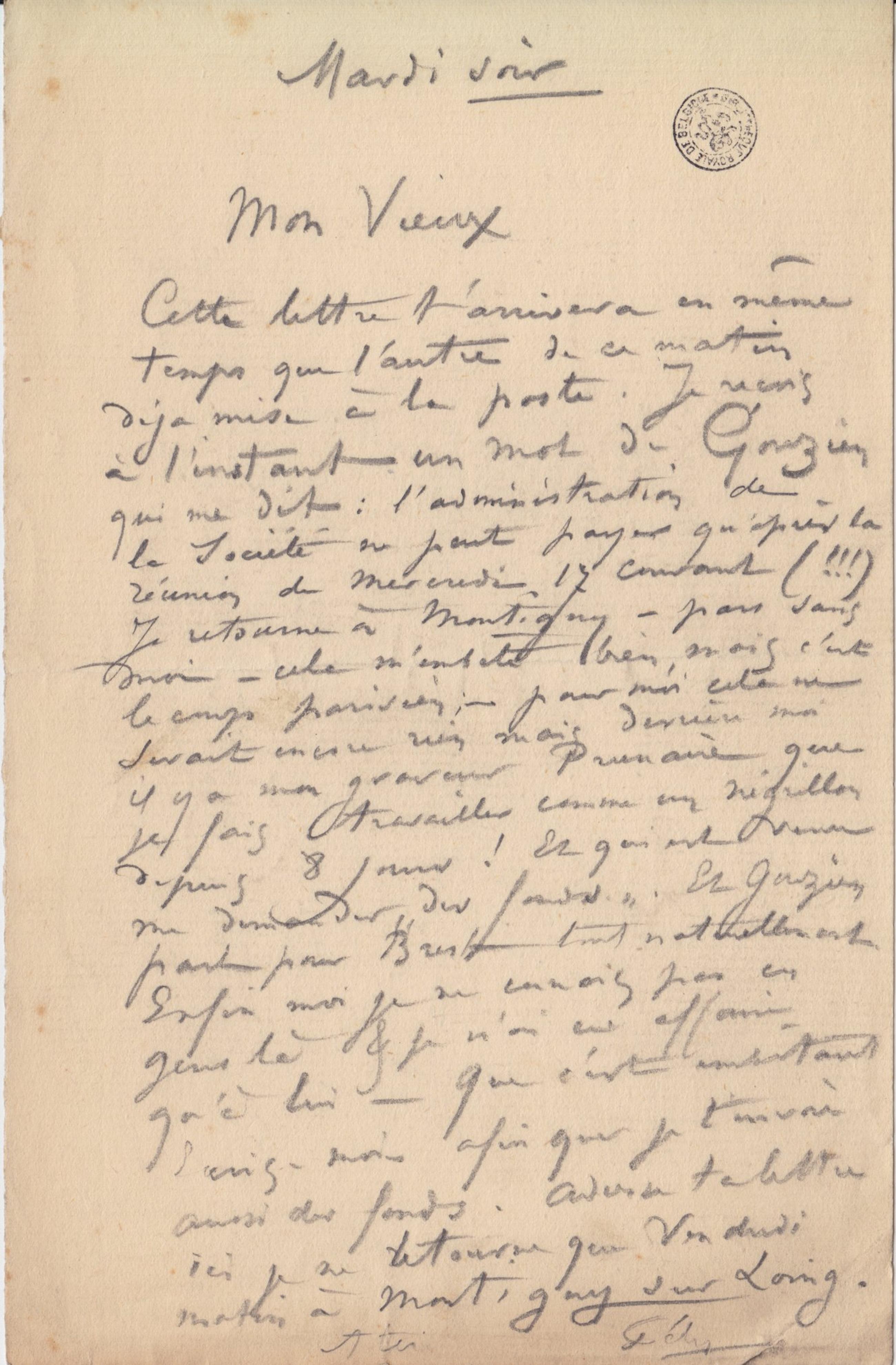 Cette lettre t’arrivera en même temps que l’autre de ce matin déja mise à la poste. Je reçois à l’instant un mot de Gouzien que me dit : l’administration de la Société ne peut payer qu’après la réunion de Mercredi 17 courant (!!!)