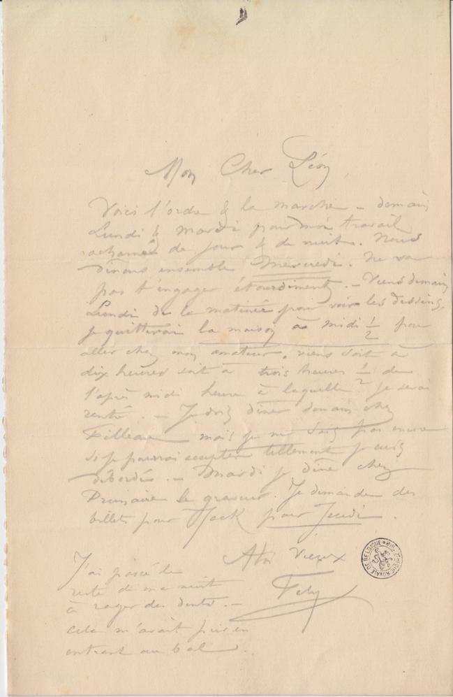 Voici l’ordre & la marche – demain Lundi & Mardi pour moi travail acharné de jour & de nuit. Nous dînons ensemble Mercredi. Ne va pas t’engager étourdiment. – Viens demain Lundi dans la matinée pour voir les dessins, je quitterai la maison à midi ½ pour aller chez mon amateur. viens soit à dix heures soit à trois heures ½ de l’après midi heure à laquelle je serai rentré. – Je vais dîner demain chez Filleau mais je ne sais pas encore si je pourrai accepter tellement je suis débordé. – Mardi je dîne chez Prunaire le graveur. Je demande des billets pour Jackpour Jeudi.