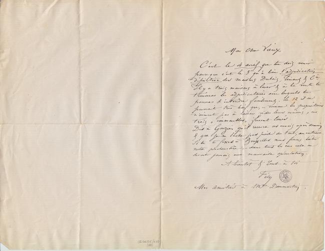 Dis à Gouzien qu’il recevra ses envois après demain & que je ne lâche pas pied du tout, au contraire. Si tu te fixes à Bruxelles nous ferons bâtir notre phalanstère, – dans tous les cas cela ne serait jamais une mauvaise spéculation.