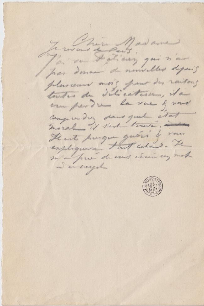 Je reviens de Paris. J’ai vu Félicien qui n’a pas donné de nouvelles depuis plusieurs mois pour des raisons toutes de délicatesse, il a cru perdre la vue & vous comprendrez dans quel état moral il s’est trouvé. à son Il est presque guéri & vous expliquera tout cela. Il m’a prié de vous écrire un mot à ce sujet