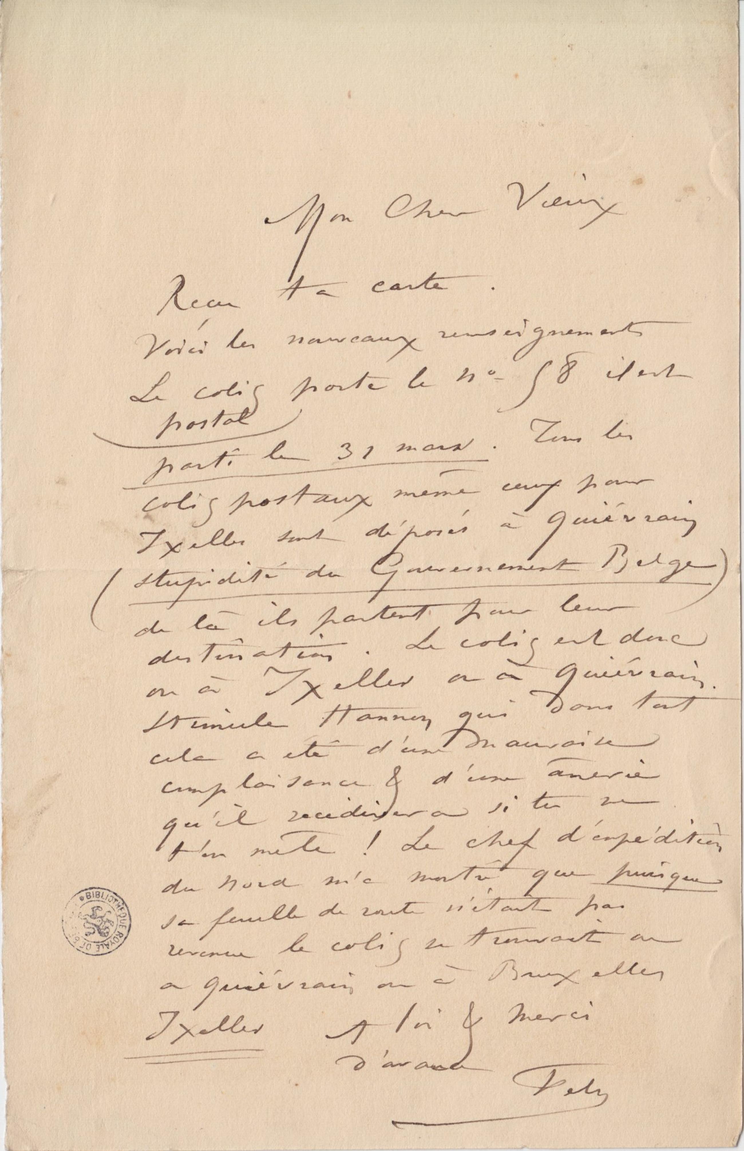 parti le 31 mars. Tous les colis postaux même ceux pour Ixelles sont déposés à Quiévrain (stupidité du Gouvernement Belge) de là ils partent pour leur destination. Le colis est donc ou à Ixelles ou à Quiévrain. Stimule Hannon qui dans tout cela a été d’une mauvaise complaisance & d’une ânerie qu’il récidivera si tu ne t’en mêle ! Le chef d’expédition du Nord m’a montré que puisque sa feuille de route n’était pas revenue le colis se trouvait ou a Quiévrain ou à Bruxelles Ixelles
