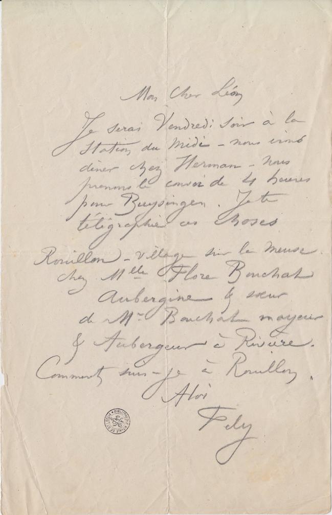 Je serai Vendredi soir à la Station du Midi – nous irons diner chez Herman – Nous prenons le convoi de 4 heures pour Buysingen. Je te télégraphie ces choses
