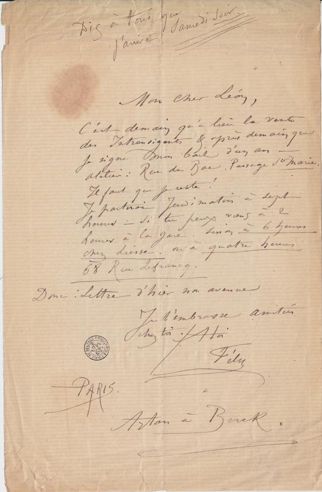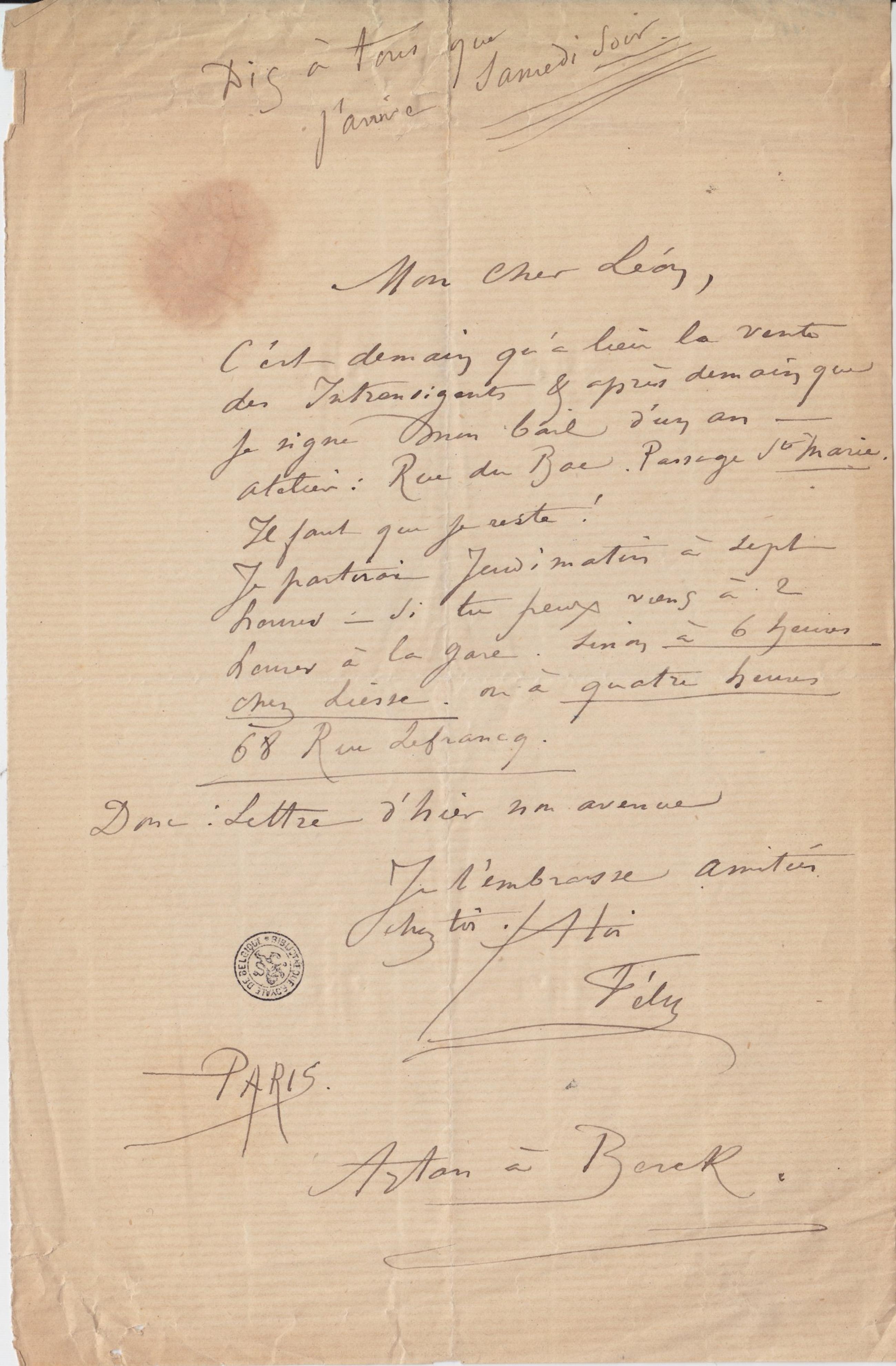Je partirai Jeudi matin à sept heures – Si tu peux viens à 2 heures à la gare. Sinon à 6 heures chez Liesse. ou à quatre heures 68 Rue Lefrancq.