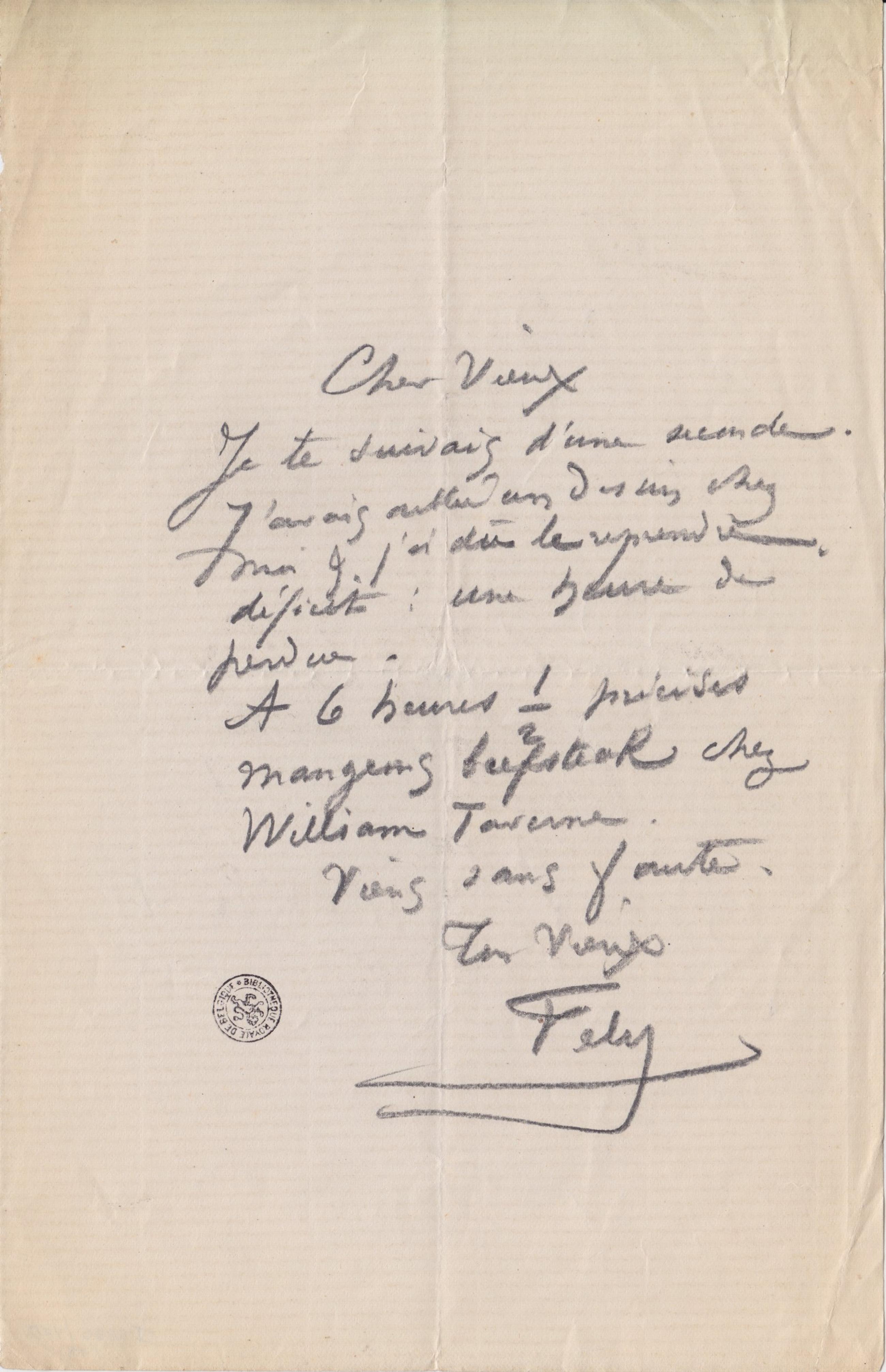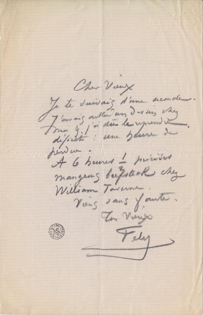 À 6 heures ½ précises mangeons beefsteak chez William Taverne.
