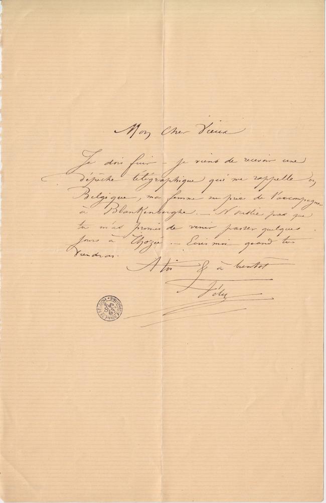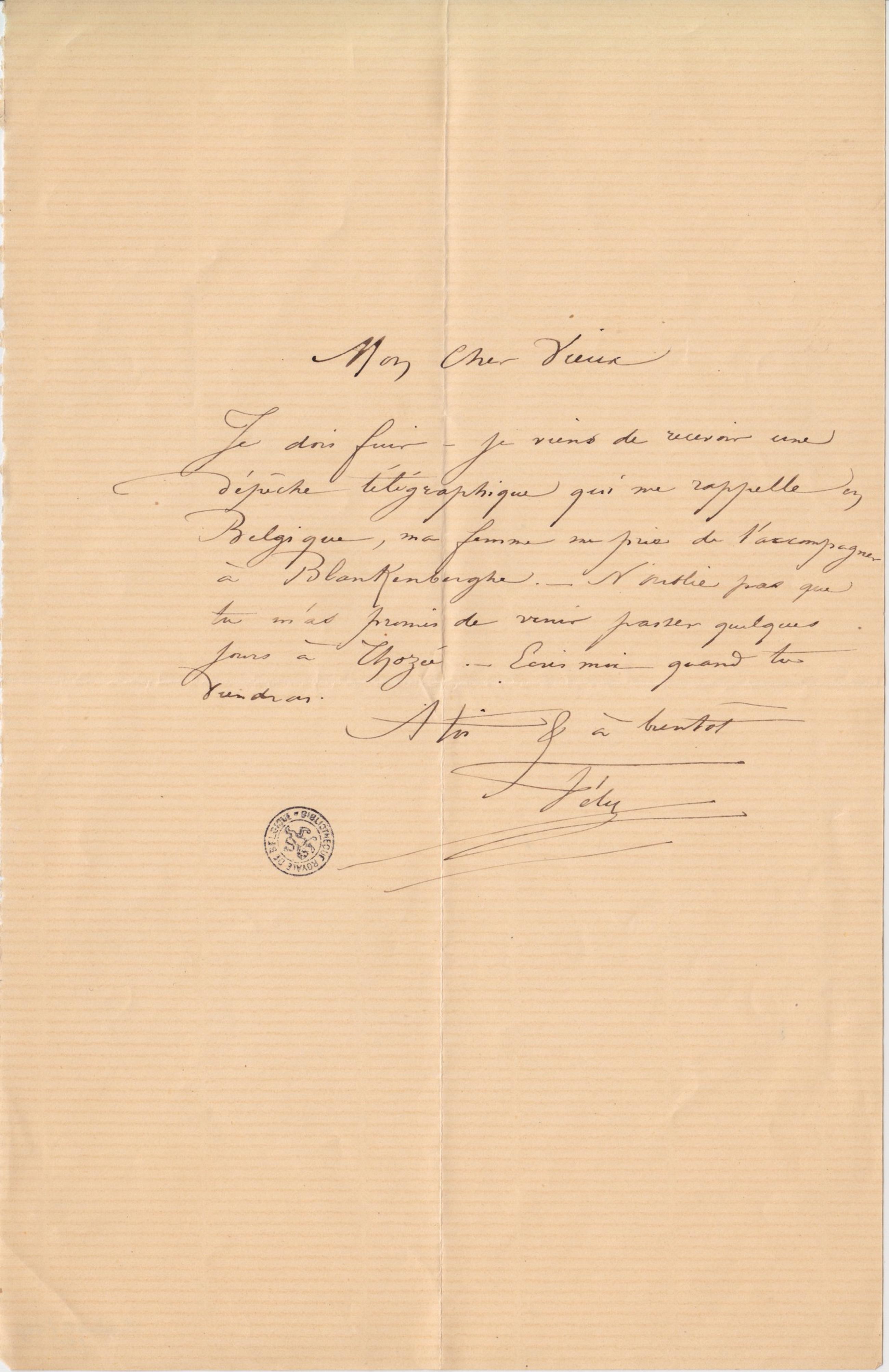Je dois fuir – je viens de recevoir une dépêche télégraphique qui me rappelle en Belgique, ma femme me prie de l’accompagner à Blankenberghe. – N’oublie pas que tu m’as promis de venir passer quelques jours à Thozée. – Écris moi quand tu viendras.