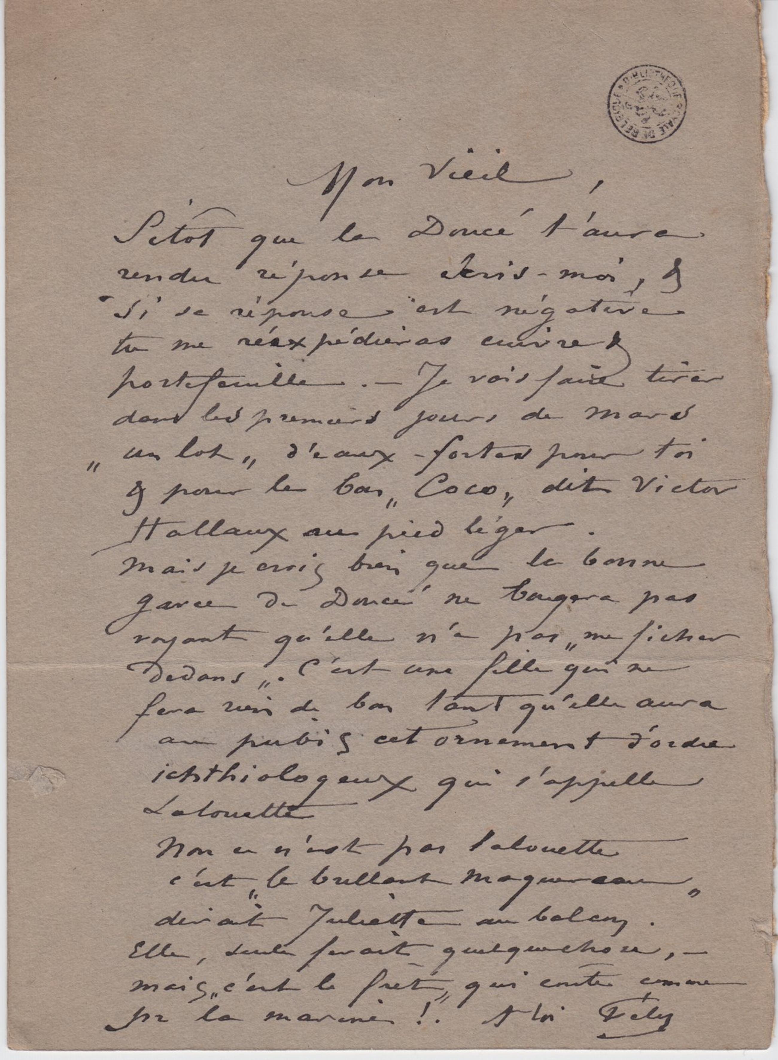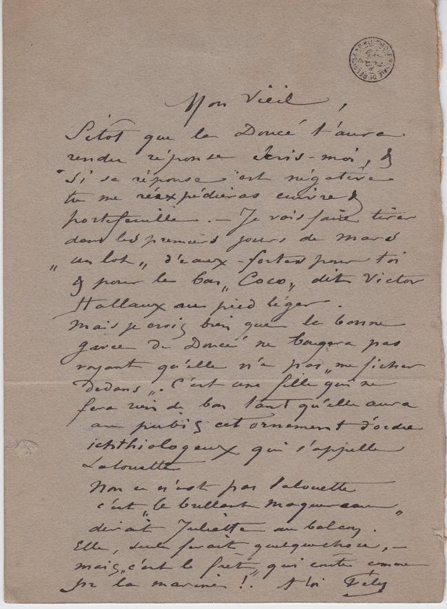 Sitôt que la Doucé t’aura rendu réponse écris-moi, & si sa réponse est négative tu me réexpédieras cuivre & portefeuille. – Je vais faire tirer dans les premiers jours de mars « un lot » d’eaux-fortes pour toi & pour le bon « Coco » dit Victor Hallaux au pied léger.