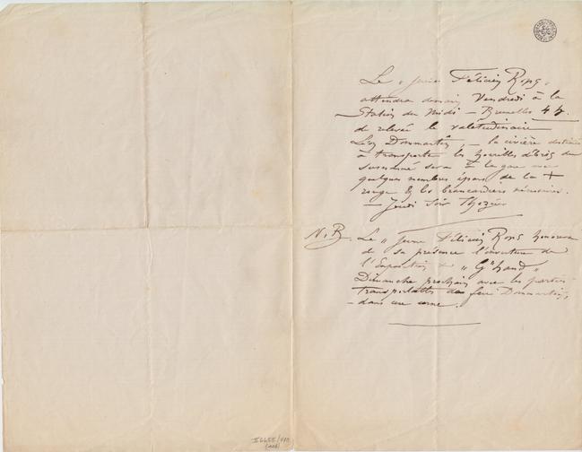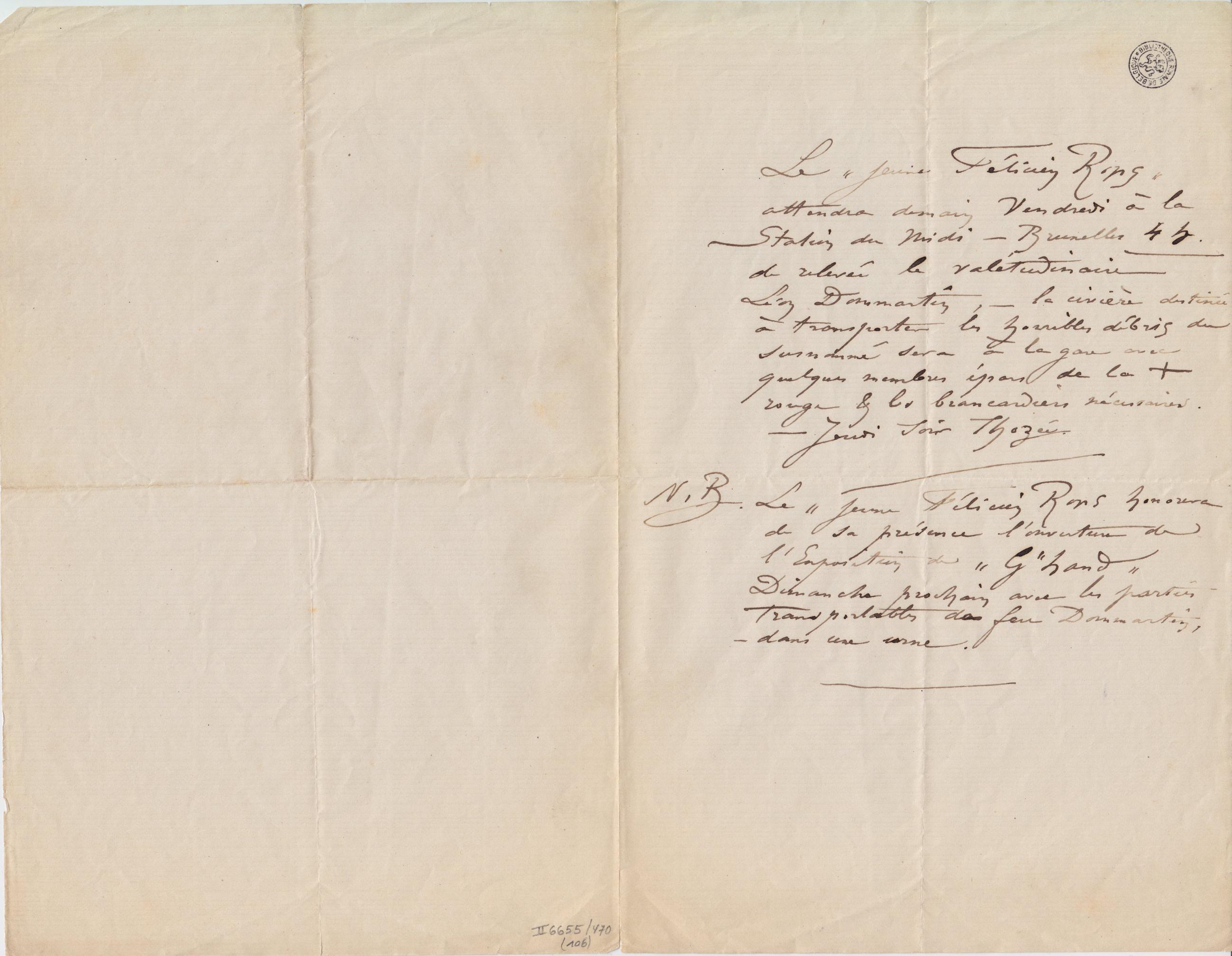 Le « Jeune Félicien Rops » attendra demain Vendredi à la Station du Midi – Bruxelles4 h. de relevée le valétudinaire Léon Dommartin, – la civière destinée à transporter les horribles débris du susnommé sera à la gare avec quelques membres épars de la + rouge & les brancardiers nécessaires.
