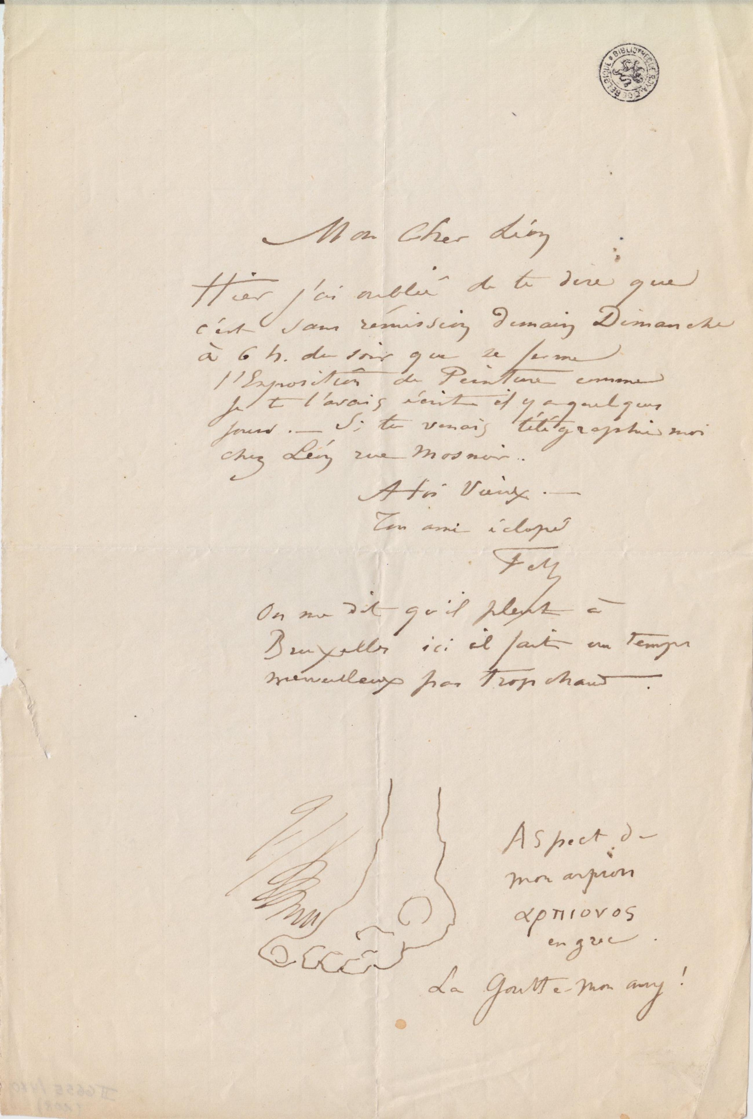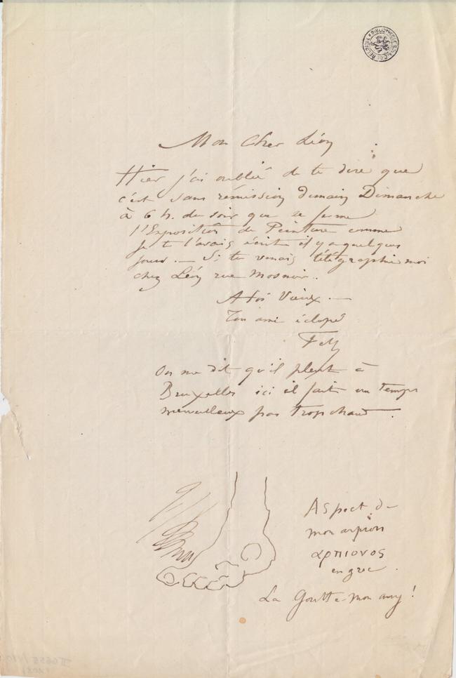 Hier j’ai oublié de te dire que c’est sans rémission demain Dimanche à 6 h. du soir que se ferme l’Exposition de Peinture comme je te l’avais écrit il y a quelques jours. – Si tu venais télégraphie moi chez Léonrue Mosnier.