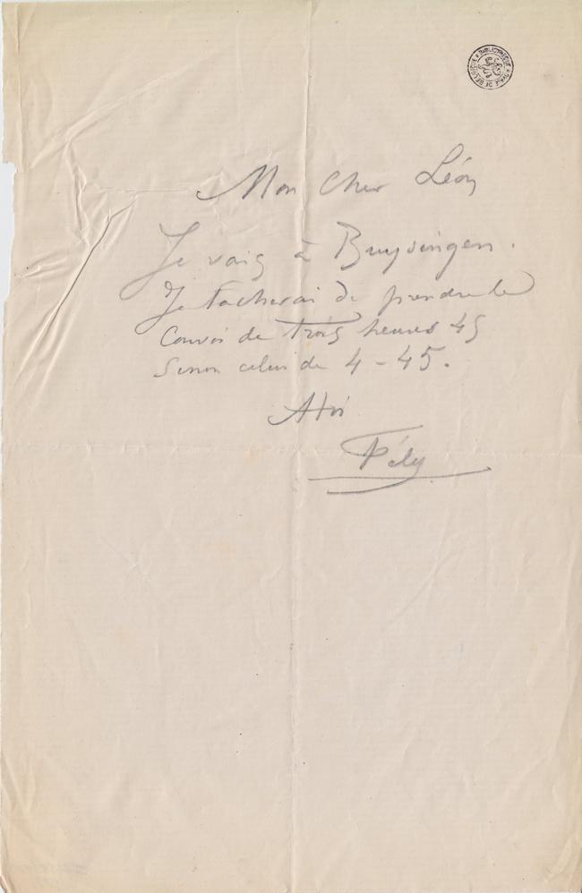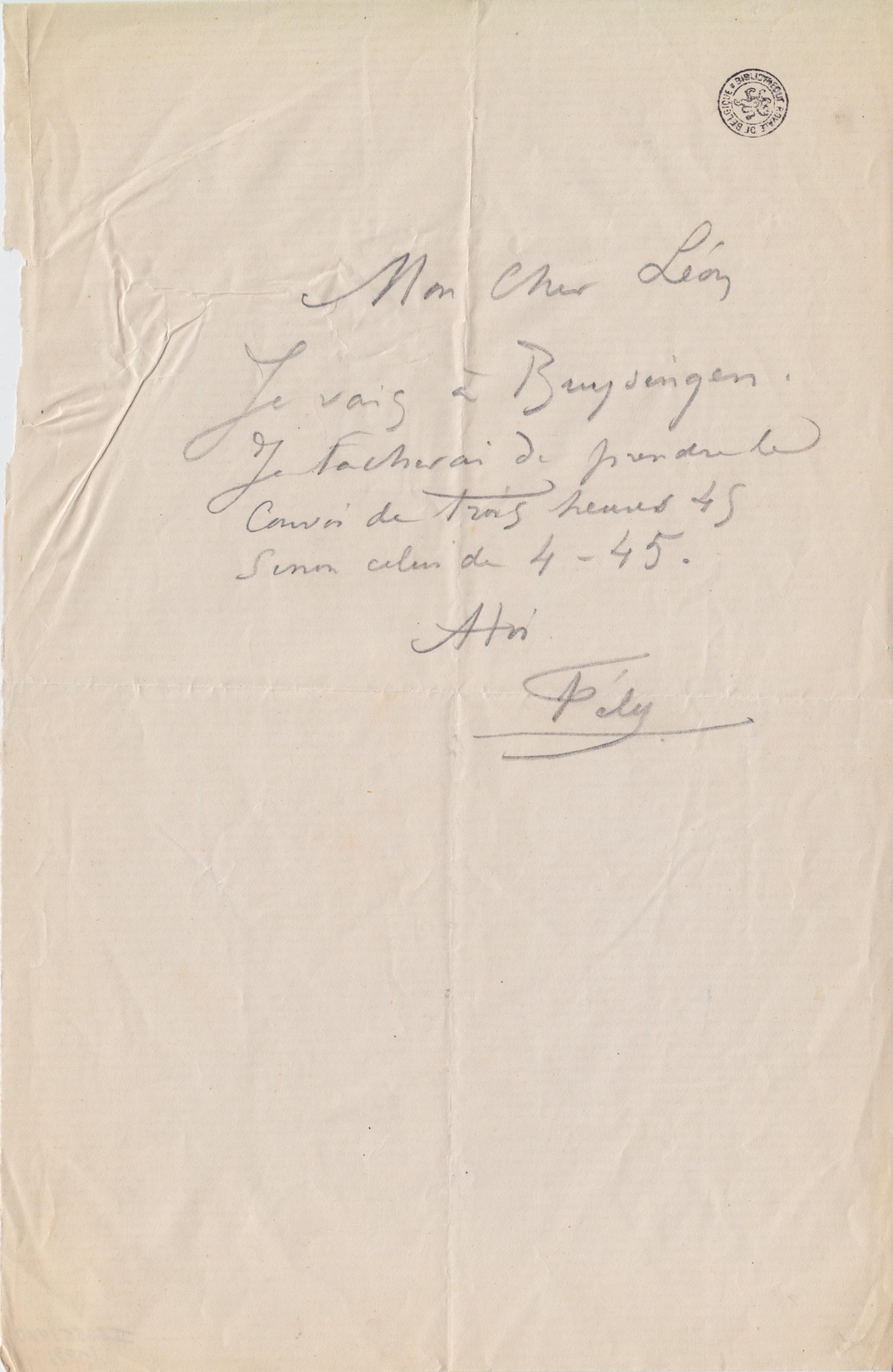 Je vais à Buysingen. Je tâcherai de prendre le convoi de trois heures 45 sinon celui de 4-45.