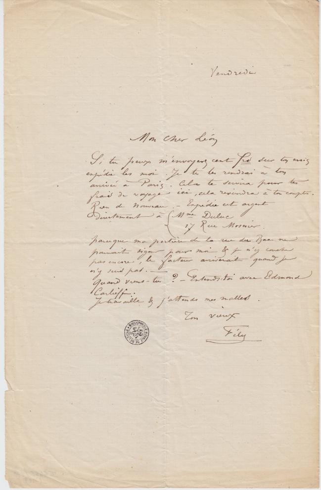 Si tu peux m’envoyer cent frs sur ton mois expédie les moi. Je te les rendrai à ton arrivée à Paris. Cela te servira pour tes frais de voyage ici, cela reviendra à ton compte. Rien de nouveau. – Expédie cet argent directement à Mme Duluc17 Rue Mosnier parce que ma portière de la rue du Bac ne pourrait signer pour moi & je n’y couche pas encore, le facteur arriverait quand je n’y suis pas. –