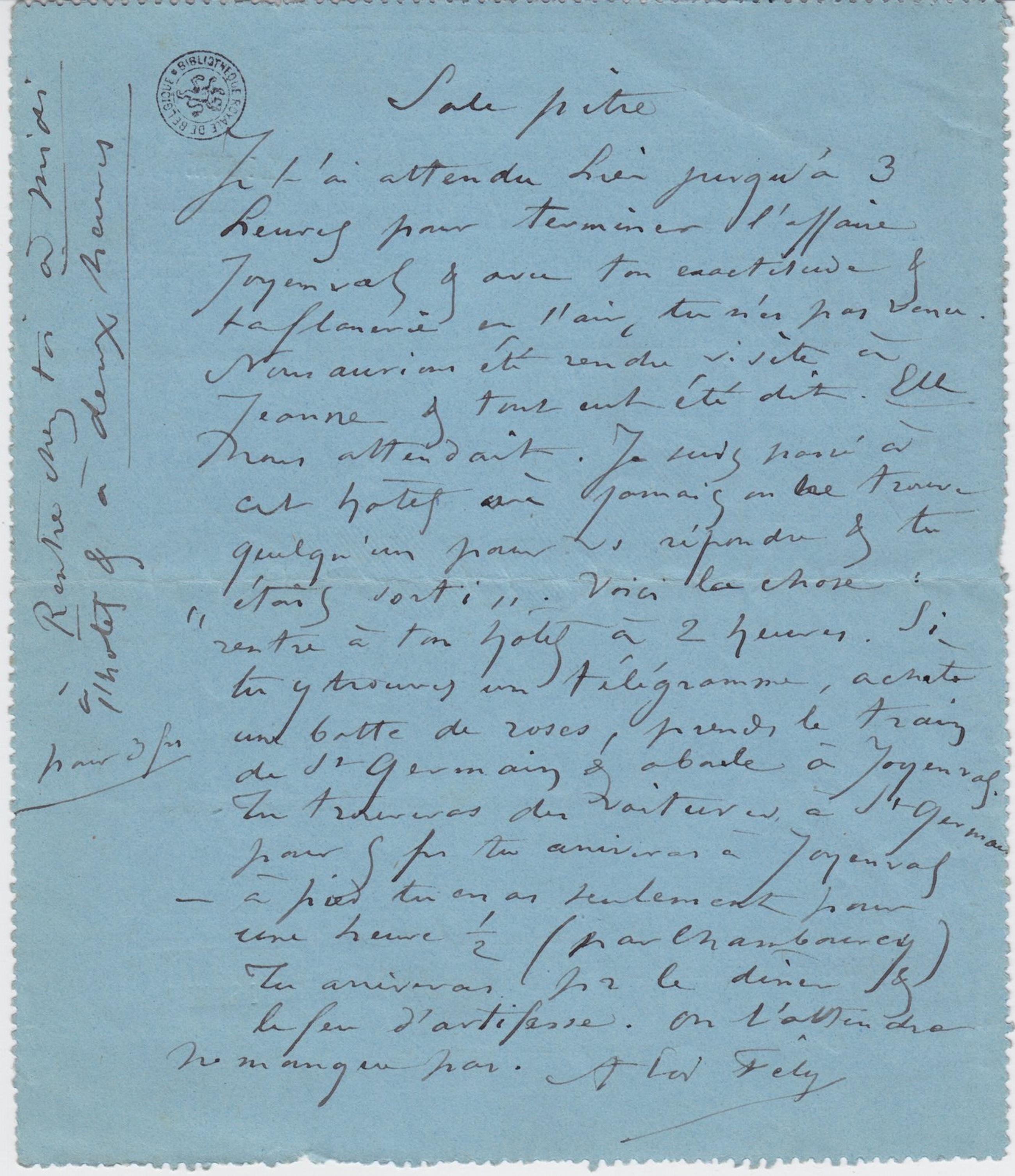 Je t’ai attendu hier jusqu’à 3 heures pour terminer l’affaire Joyenval & avec ton exactitude & ta flanerie en l’air, tu n’es pas venu. Nous aurions été rendre visité à Jeanne & tout eut été dit. Elle nous attendait. Je suis passé à cet hôtel où jamais on ne trouve quelqu’un pour vous répondre & tu « étais sorti ». Voici la chose : rentre à ton hôtel à 2 heures. Si tu y trouves un télégramme, achète une botte de roses pour 3 frs, prends le train de St Germain & aboule à Joyenval. Tu trouveras des voitures à St Germain pour 5 frs tu arriveras à Joyenval – à pied tu en as seulement pour une heure ½ (par Chambourcy) Tu arriveras pour le dîner & le feu d’artifesse. On t’attendra