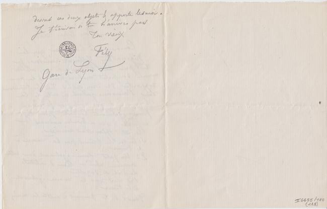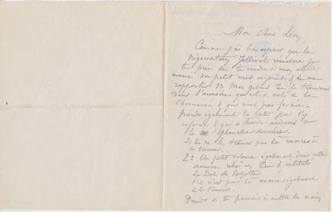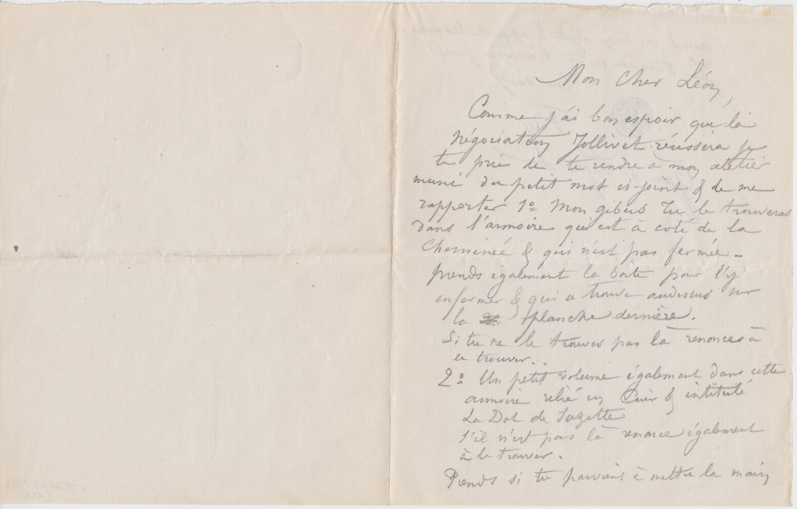 Comme j’ai bon espoir que la négociation Jollivet réussira je te prie de te rendre à mon atelier muni du petit mot ci-joint & de me rapporter 1° Mon gibus Tu le trouveras dans l’armoire qui est à coté de la cheminée & qui n’est pas fermée – prends également la boite pour l’y enfermer & qui se trouve audessus sur la v planche dernière.
