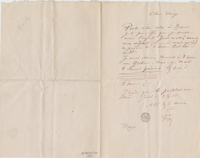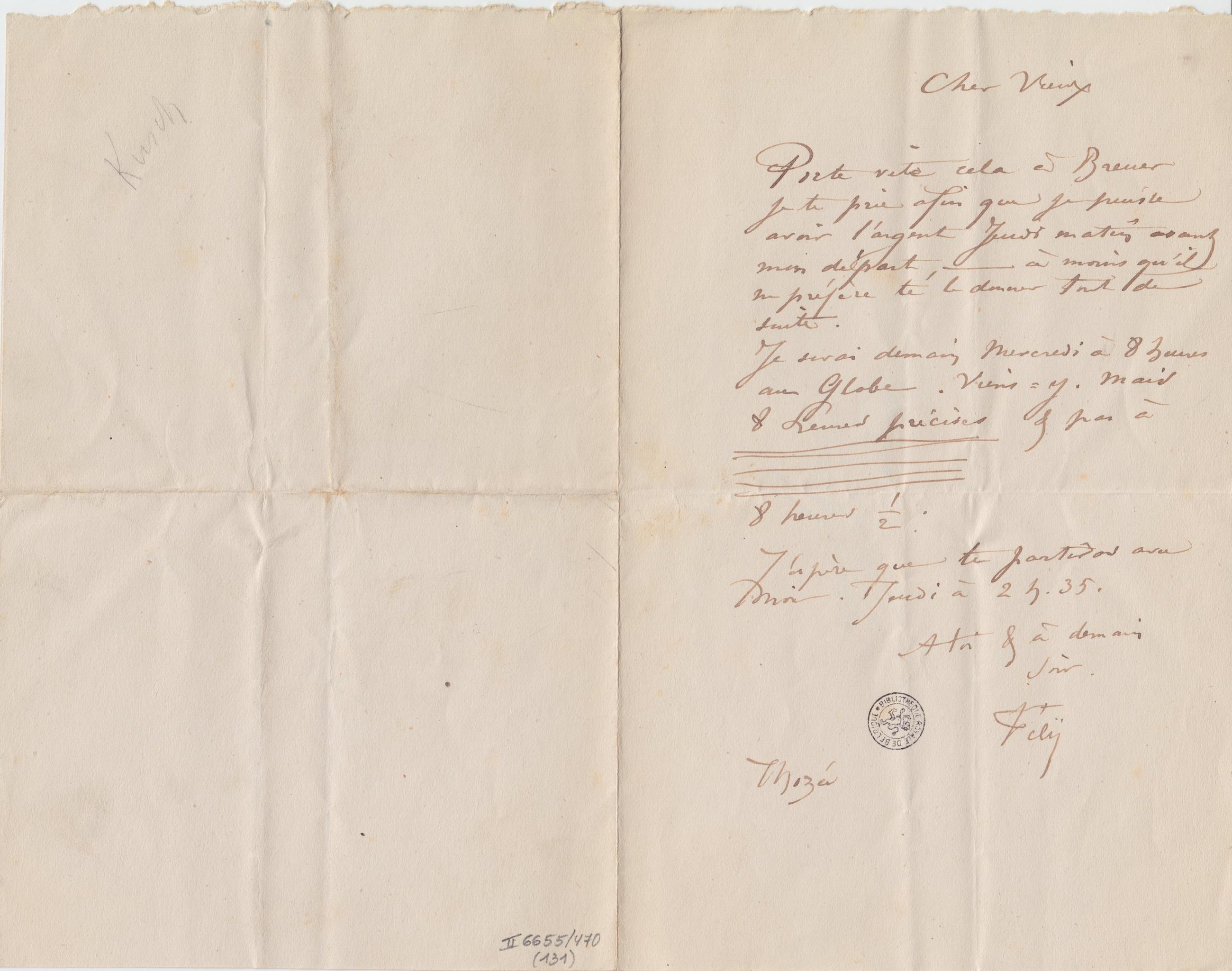 Porte vite cela à Breuer je te prie afin que je puisse avoir l’argent Jeudi matin avant mon départ, – à moins qu’il ne préfère te le donner tout de suite.