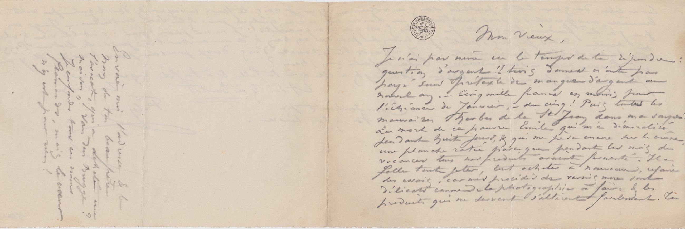 Je n’ai pas même eu le temps de te répondre : question d’argent !! trois dames n’ont pas payé sous prétexte de manque d’argent au nouvel an. – Cinq mille francs en moins pour l’échéance de Janvier, – du cinq ! Puis toutes les mauvaises herbes de la St Jean dans ma soupe ! La mort de ce pauvre Émile qui m’a démoralisé pendant huit jours, & qui me pèse encore sur le crâne, une planche ratée parce que pendant les mois de vacances tous mes produits avaient fermenté. Il a fallu tout jeter, tout acheter à nouveau, refaire les envois, car mes procédés de vernis mou sont délicats comme de la photographie à faire & les produits qui me servent s’altèrent facilement. Tu