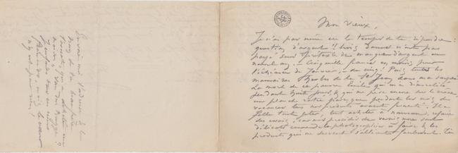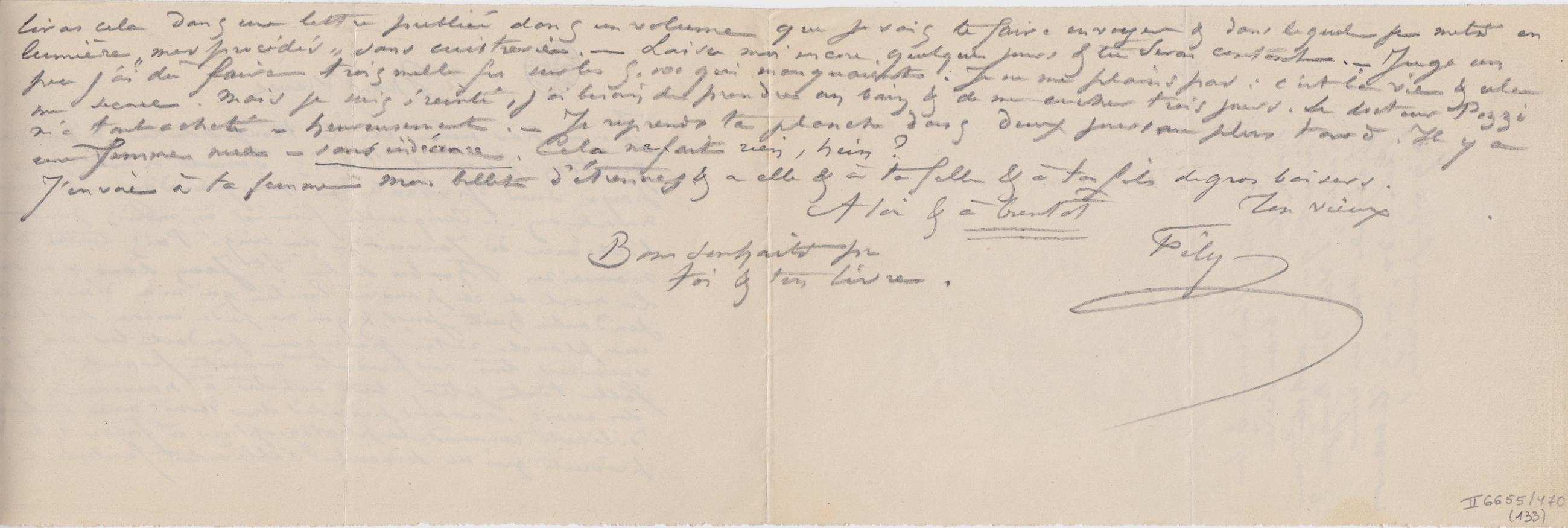 liras cela dans une lettre publiée dans un volume que je vais te faire envoyer & dans lequel je mets en lumière « mes procédés » sans cuistrerie. – Laisse moi encore quelque jours & tu seras content. – Juge un peu j’ai dû faire trois mille frs sur les 5.000 qui manquaient. Je ne me plains pas : c’est la vie & cela me secoue. Mais je suis éreinté, j’ai besoin de prendre un bain & de me coucher trois jours. Le docteur Pozzi m’a tout acheté – heureusement. – Je reprends ta planche dans deux jours au plus tard. Il y a une femme nue – sans indécence. Cela ne fait rien, hein ? J’envoie à ta femme mon billet d’étrennes & a elle & à ta fille & à ton fils de gros baisers.