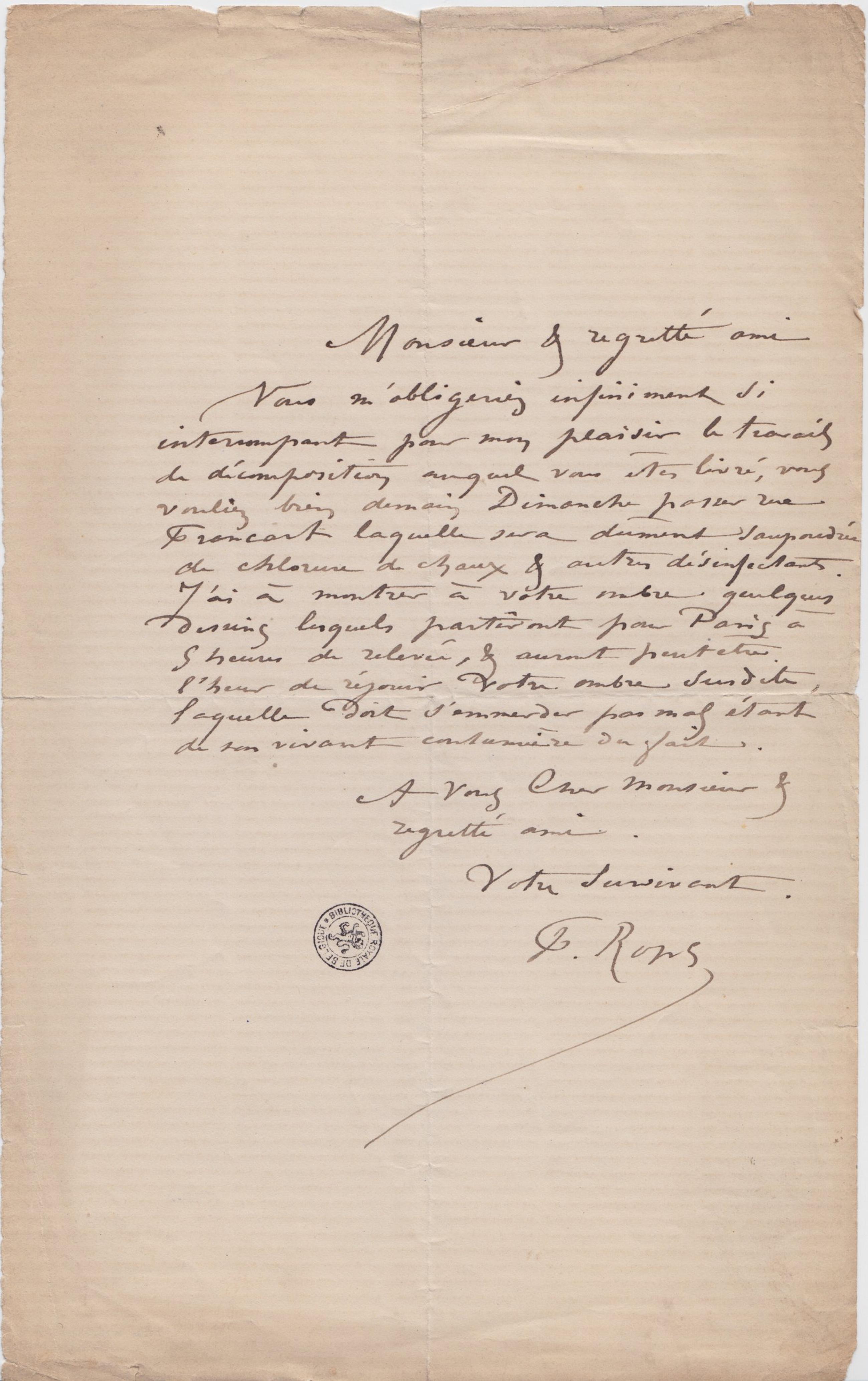 Vous m’obligeriez infiniment si interrompant pour mon plaisir le travail de décomposition auquel vous êtes livré, vous vouliez bien demain Dimanche passer rue Francart laquelle sera dûment saupoudrée de chlorure de chaux & autres désinfectants. J’ai à montrer à votre ombre quelques dessins lesquels partiront pour Paris à 5 heures de relevée, & auront peut être l’heur de réjouir votre ombre susdite, laquelle doit s’emmerder pas mal étant de son vivant coutumière du fait.