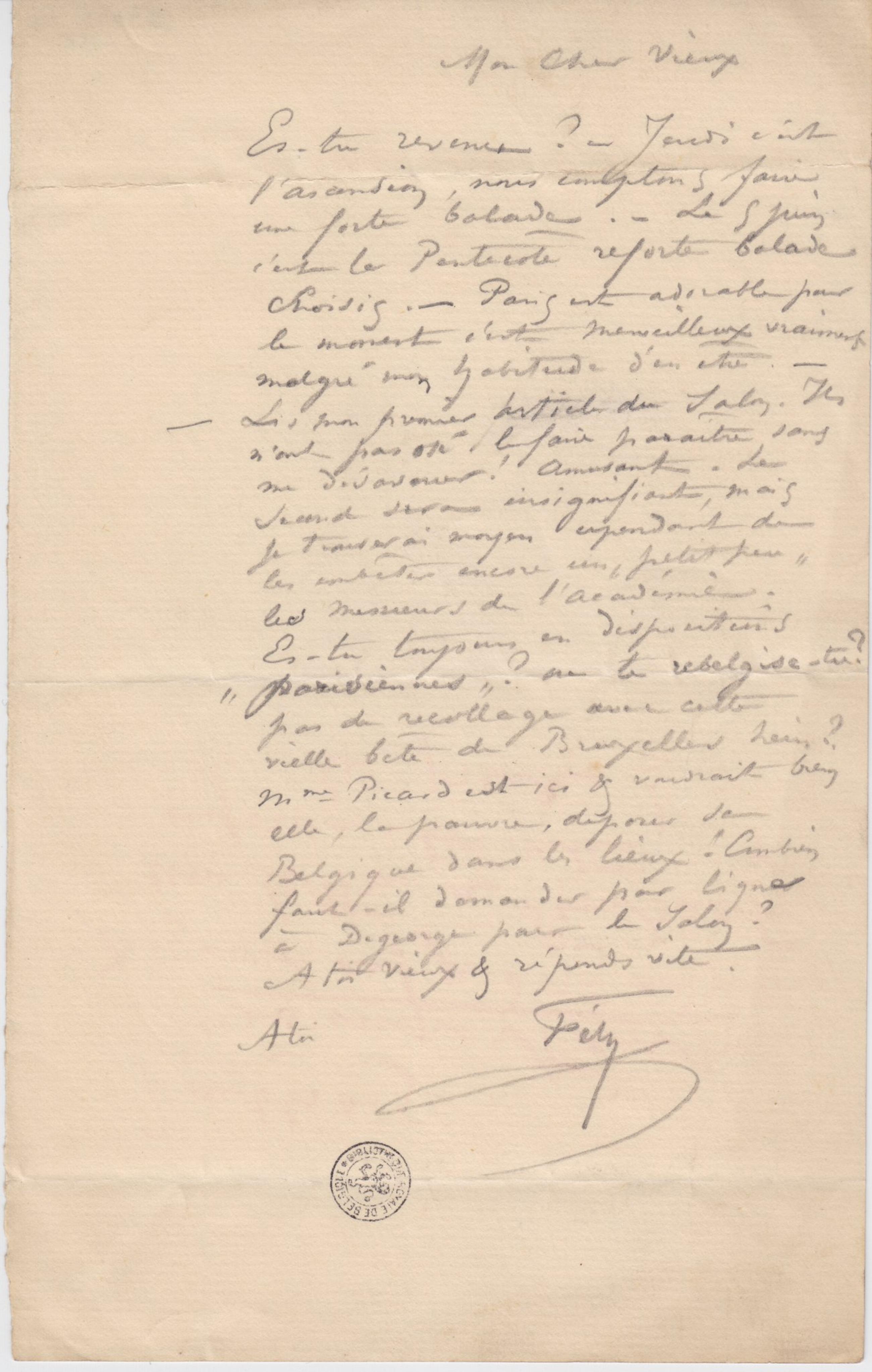 – Lis mon premier article du Salon. Ils n’ont pas osé le faire paraître sans me désavouer ! Amusant. Le second sera insignifiant, mais je trouverai moyen cependant de les embêter encore un « petit peu » les Messieurs de l’Académie. Es-tu toujours en dispositions « parisiennes » ? ou te rebelgise-tu ? pas de recollage avec cette vieille bête de Bruxelles hein ? Mme Picard est ici & voudrait bien elle, la pauvre, déparer sa Belgique dans les lieux ! Combien faut-il demander par ligne à Degeorge pour le Salon ?