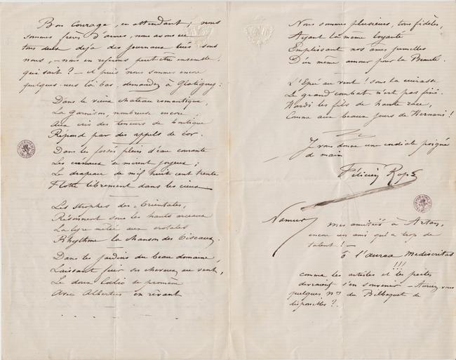 Artan notre ami commun m’a remis de votre part une pièce de vers pour la faire parvenir à Alfred Delvau. – J’ai gardé ces vers jusqu’aujourd’hui, ce dont je vous prie de m’excuser, – je comptais retourner de suite à Paris et les remettre moi-même à Delvau, mon voyage étant retardé, je viens de les lui envoyer.