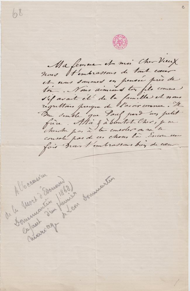 Ma femme et moi Cher Vieux nous t’embrassons de tout cœur et nous sommes en pensée près de toi. Nous aimions ton fils comme s’il avait été de la famille et nous regrettons presque de l’avoir connu. Il me semble que Paul perd un petit frère.