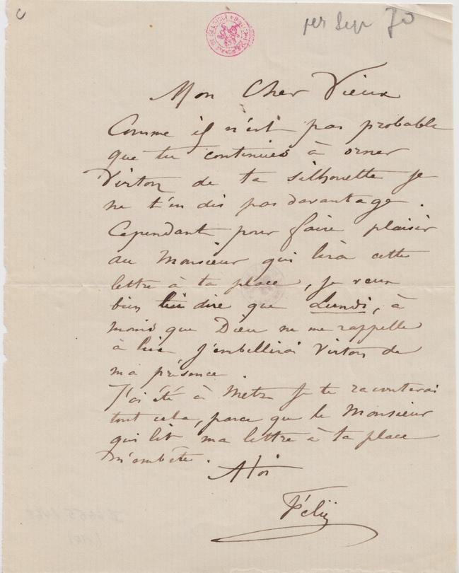 Cependant pour faire plaisir au Monsieur qui lira cette lettre à ta place, je veux bien lui dire que Lundi, à moins que Dieu ne me rappelle à lui j’embellirai Virton de ma présence.