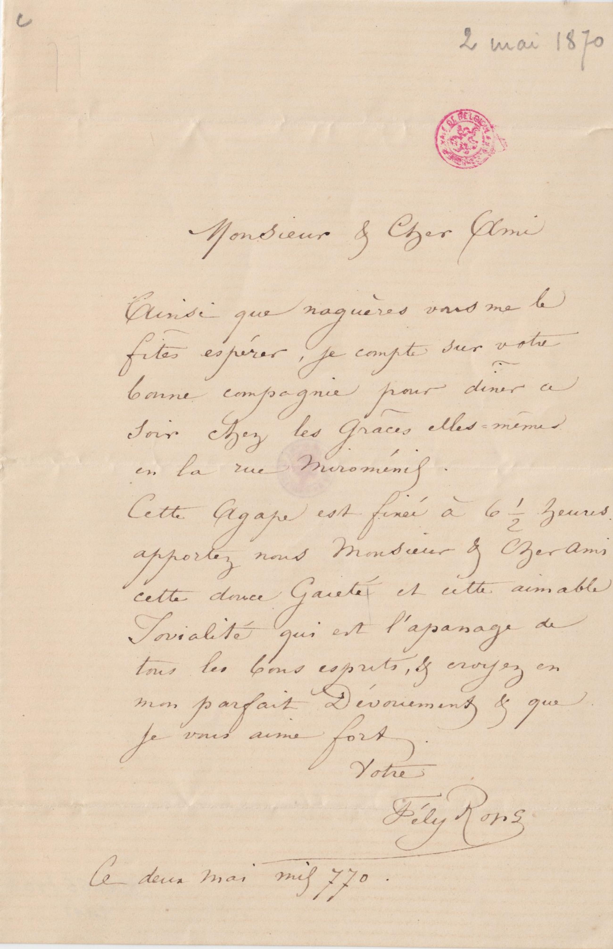 Cette Agape est fixée à 6 ½ heures. apportez nous Monsieur & Cher Ami cette douce Gaieté et cette aimable Jovialité qui est l’apanage de tous les bons esprits, & croyez en mon parfait Dévouement & que je vous aime fort.