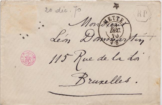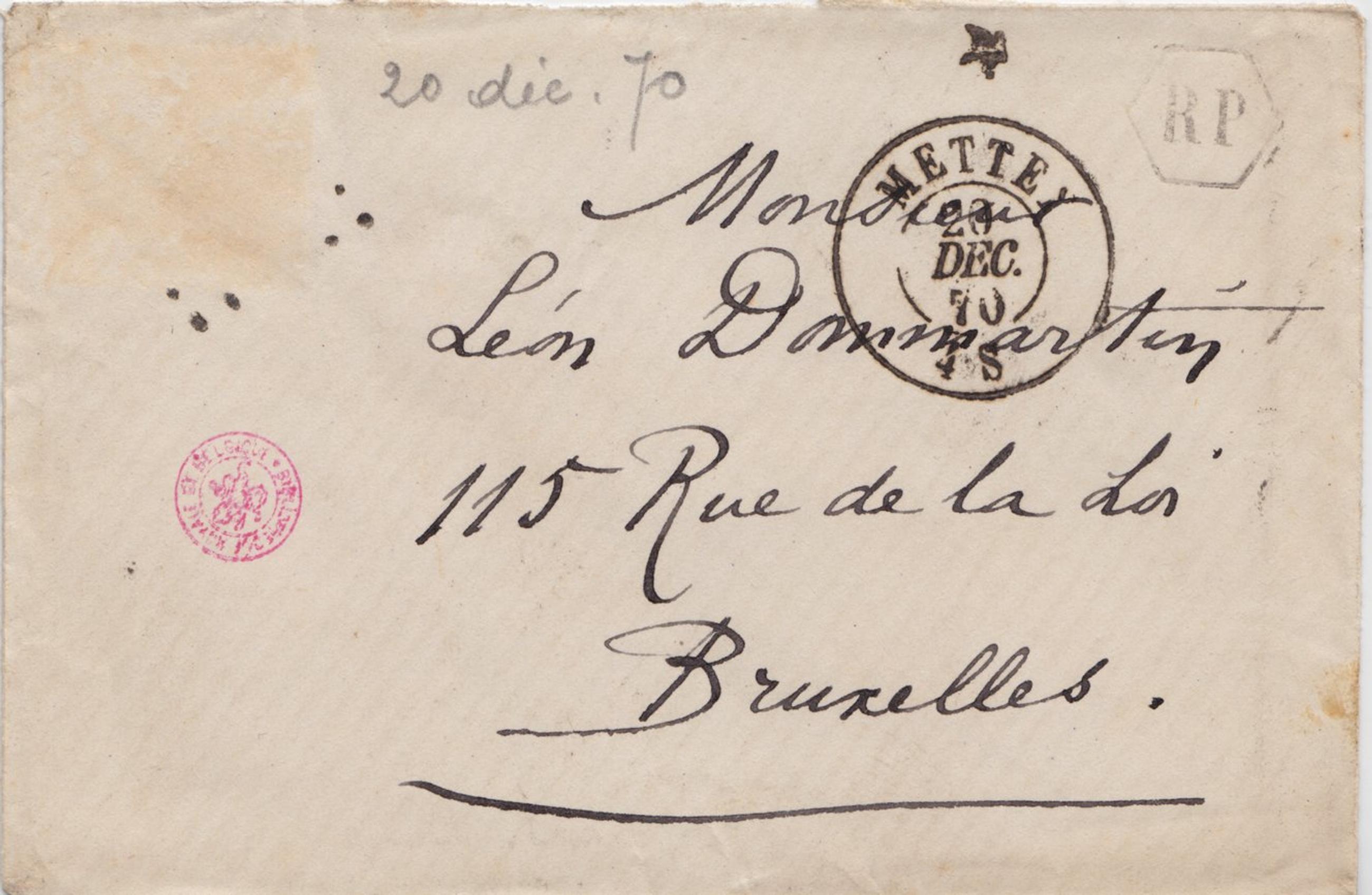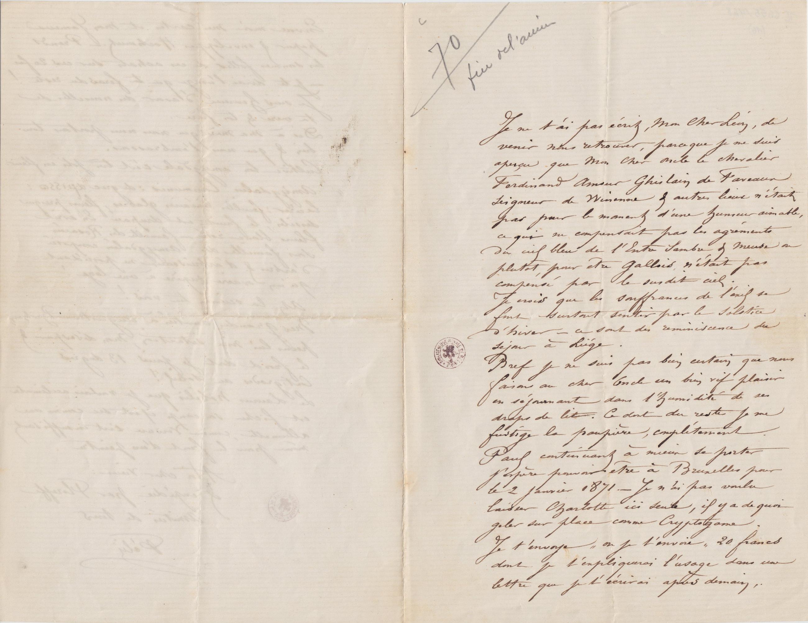 Bref je ne suis pas bien certain que nous faisons au cher Oncle un bien vif plaisir en séjournant dans l’humidité de ses draps de lit. Ce dont du reste je me fustige la paupière, complétement. Paul continuant à mieux se porter j’espère pouvoir être à Bruxelles pour le 2 janvier 1871. – Je n’ai pas voulu laisser Charlotte ici seule, il y a de quoi geler sur place comme Cryptogame. Je t’envoye « ou je t’envoie » 20 francs dont je t’expliquerai l’usage dans une lettre que je t’écrirai après demain,.