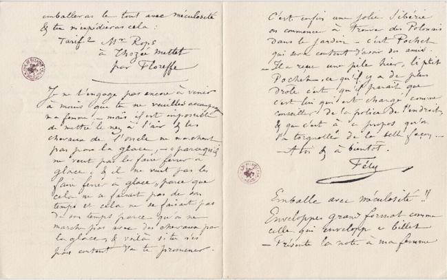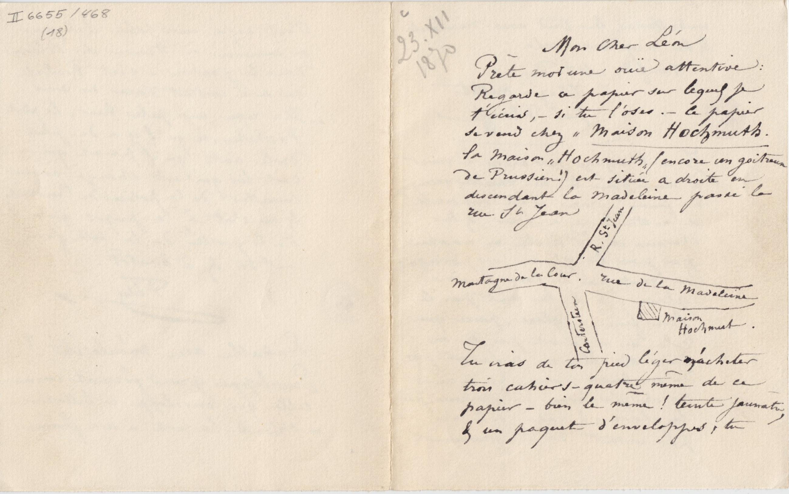 Prête moi une ouïe attentive : Regarde ce papier sur lequel je t’écris, – si tu l’oses. – Ce papier se vend chez « Maison Hochmuth. la maison « Hochmuth » (encore un goitreux de Prussien !) est située a droite en descendant la Madeleine passé la rue St Jean