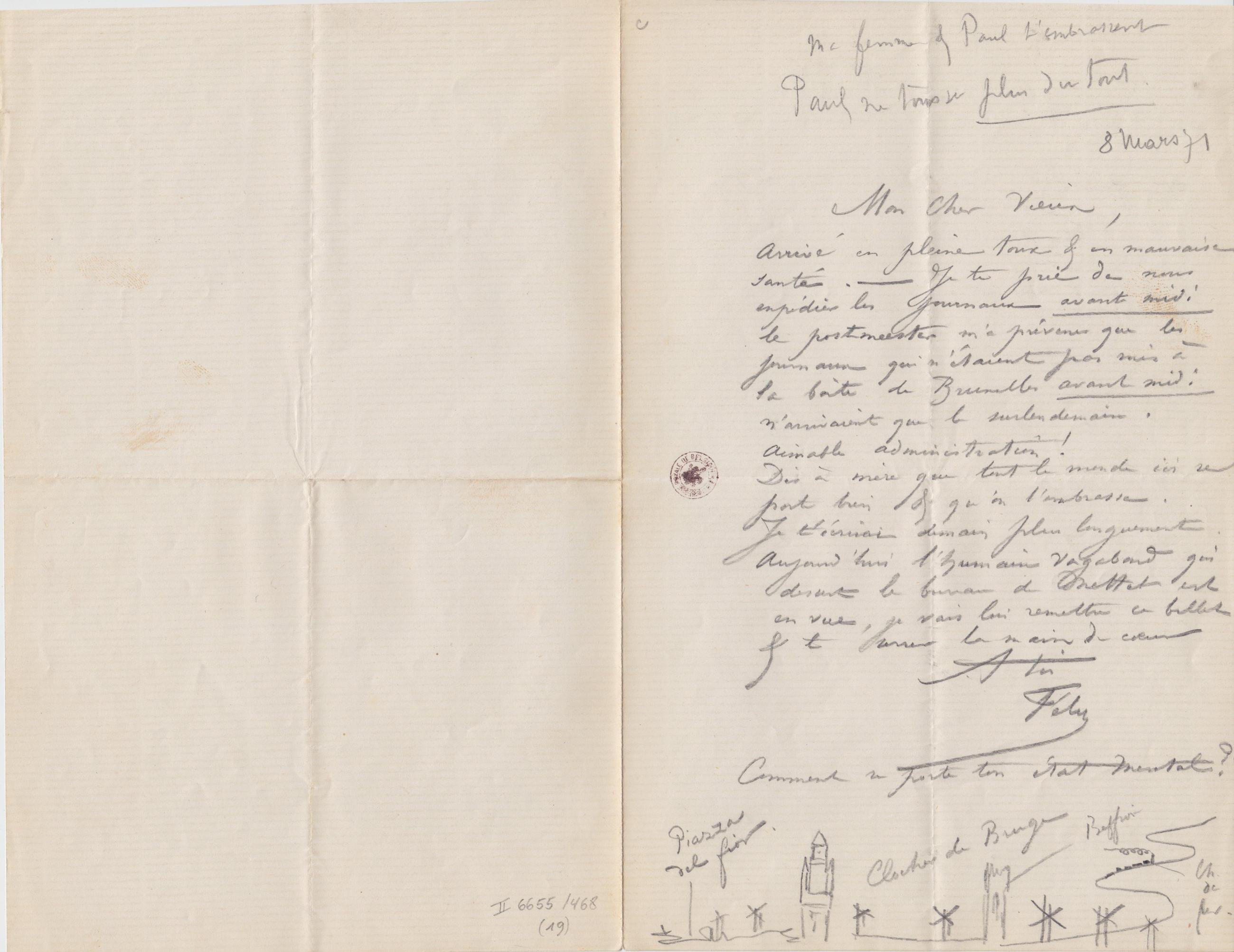 Arrivé en pleine toux & en mauvaise santé. – Je te prie de nous expédier les journaux avant midi le postmeester m’a prévenu que les journaux qui n’étaient pas mis à la boîte de Bruxelles avant midi n’arrivaient que le surlendemain.