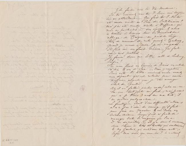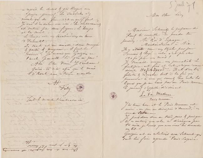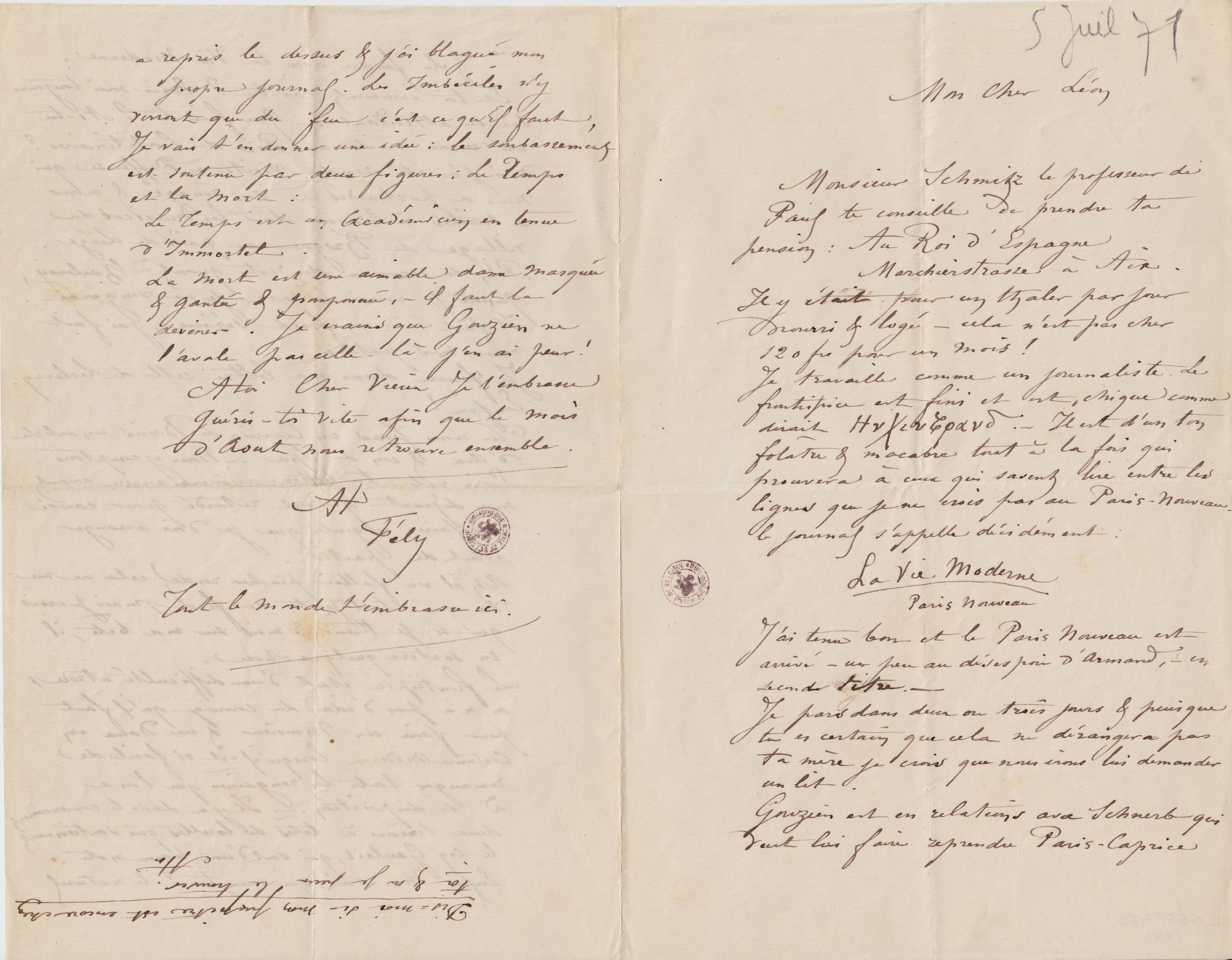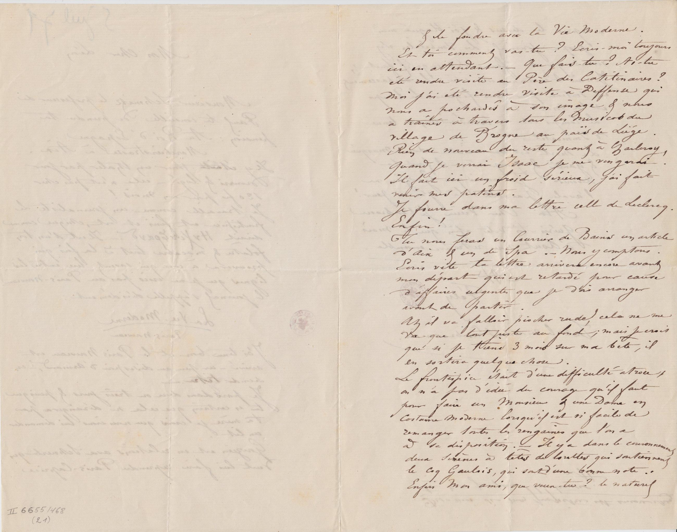 Tu nous feras un Courrier de Bains un article d’Aix & un de Spa. – Nous y comptons. Écris vite ta lettre arrivera encore avant mon départ qui est retardé pour cause d’affaires urgentes que je dois arranger avant de partir.