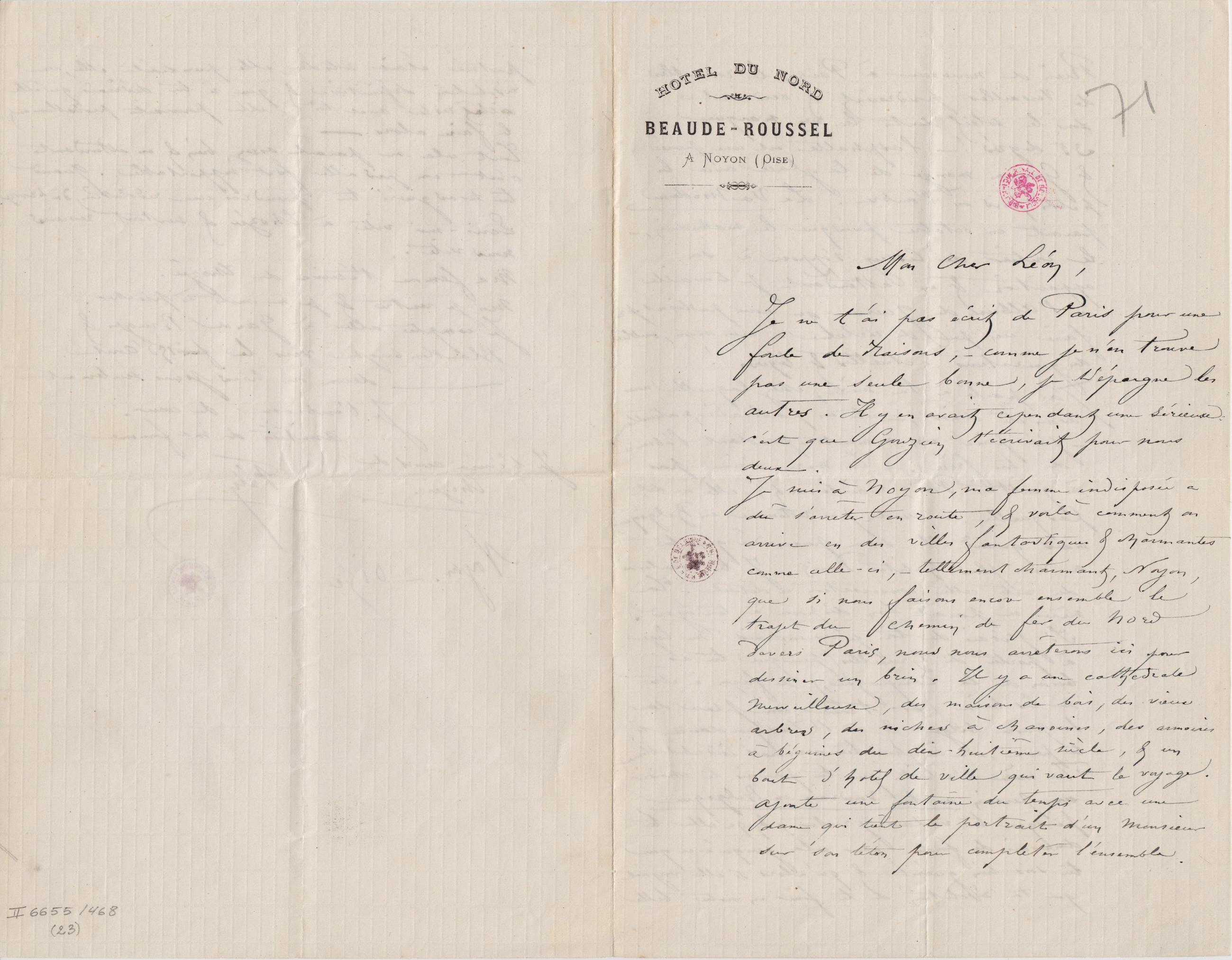 Écrite en Plume Noir. En-tête: HOTEL DU NORD - BEAUDE-ROUSSEL A Noyon (Oise).