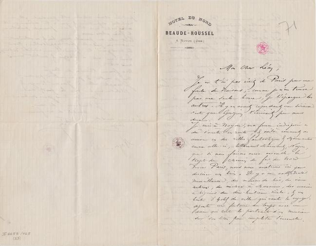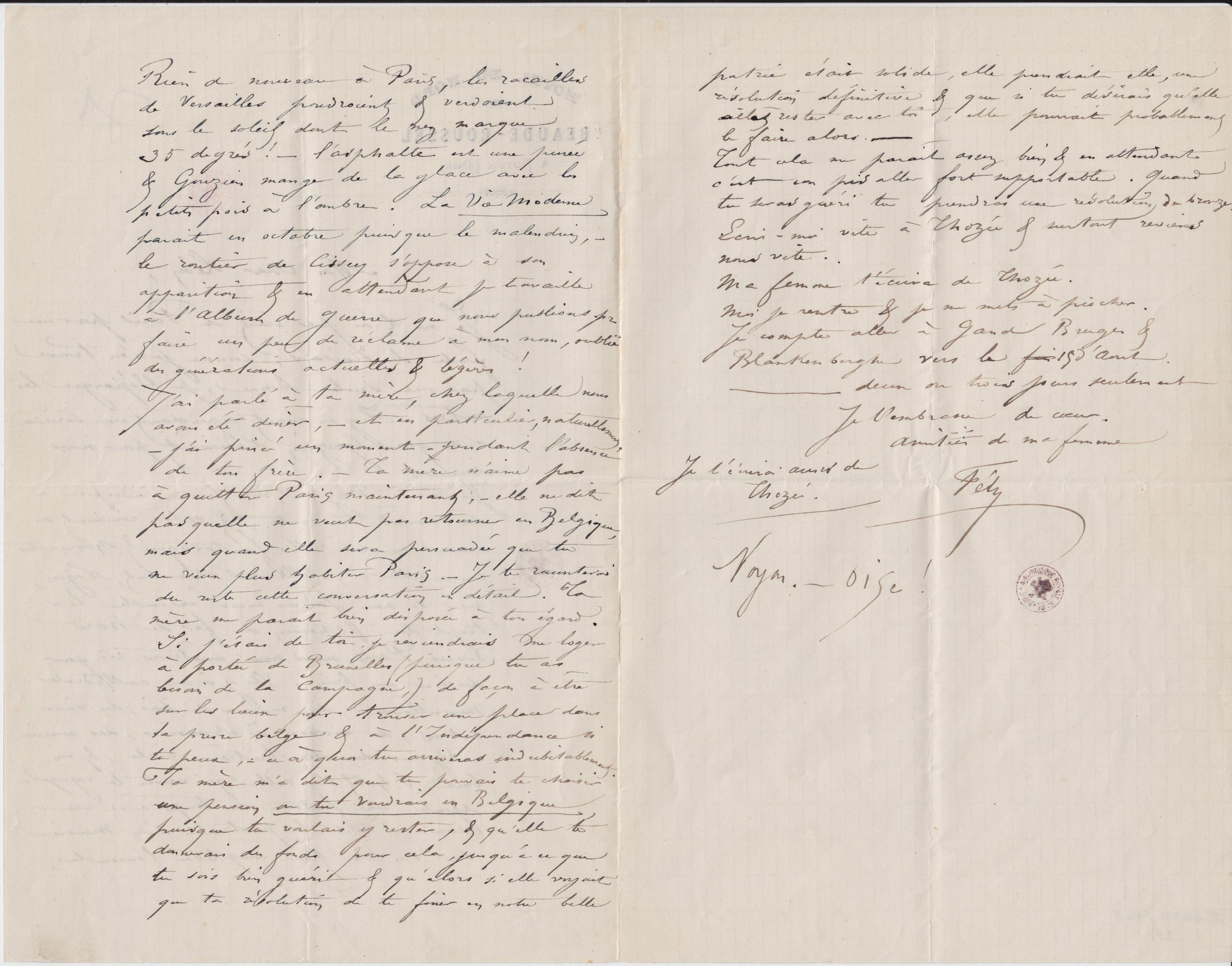 J’ai parlé à ta mère, chez laquelle nous avons été dîner, – et en particulier, naturellement, – j’ai pincé un moment – pendant l’absence de ton frère. – Ta mère n’aime pas à quitter Paris maintenant, – elle ne dit pas qu’elle ne veut pas retourner en Belgique, mais quand elle sera persuadée que tu ne veux plus habiter Paris. – Je te raconterai du reste cette conversation en détail. Ta mère me paraît bien disposée à ton égard. Si j’étais de toi, je reviendrais me loger à portée de Bruxelles (puisque tu as besoin de la campagne,) de façon à être sur les lieux pour trouver une place dans la presse belge & à l’Indépendance si tu peux, – ce à quoi tu arriveras indubitablement. Ta mère m’a dit que tu pouvais te choisir une pension où tu voudrais en Belgique puisque tu voulais y rester, & qu’elle te donnerais des fonds pour cela, jusqu’a ce que tu sois bien guéri & qu’alors si elle voyait que ta résolution de te fixer en notre belle