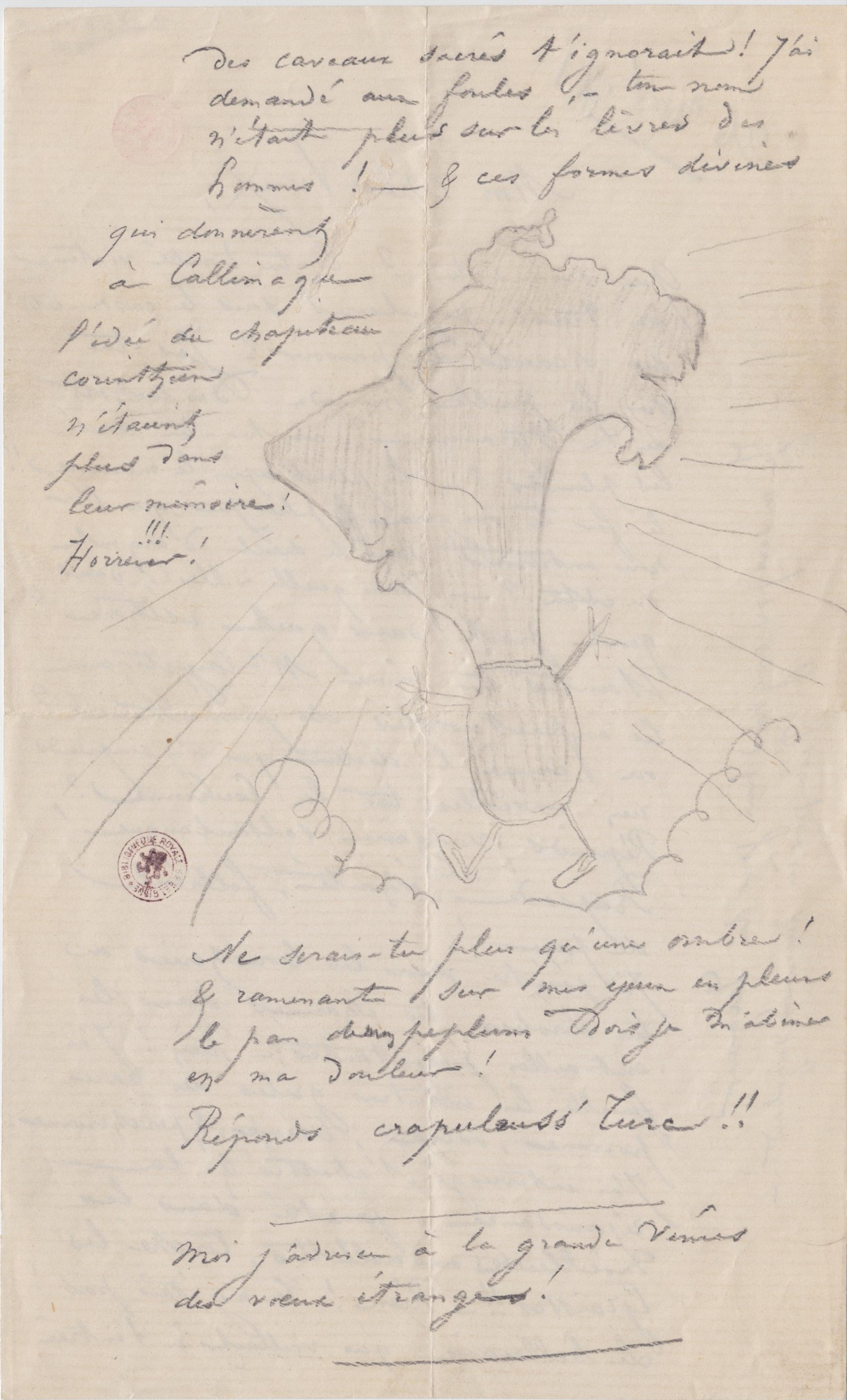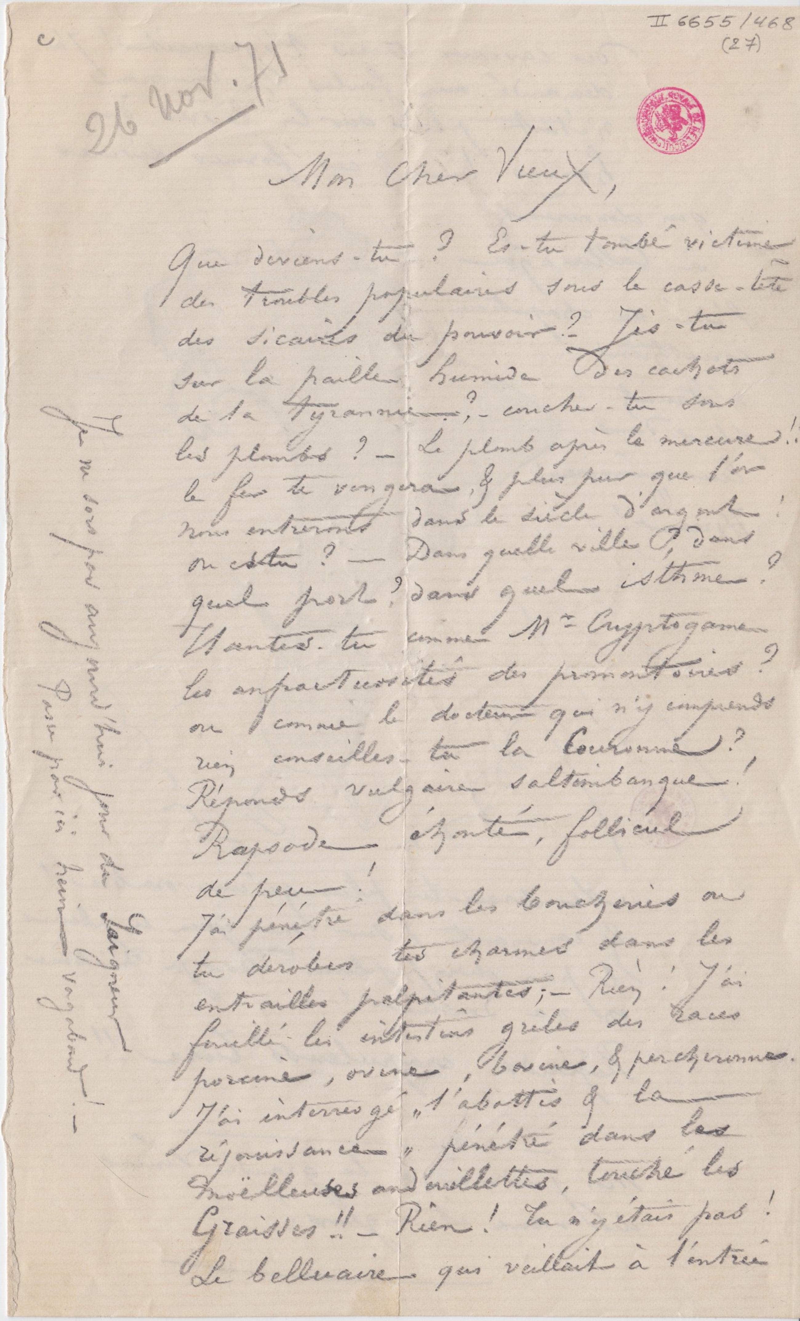 Que deviens-tu ? Es-tu tombé victime des troubles populaires sous le casse-tête des sicaires du pouvoir ? – Jis-tu sur la paille humide des cachots de la tyrannie ? – couches-tu sous les plombs ? – Le plomb après le mercure !! le fer te vengera, & plus pur que l’or nous entrerons dans le siècle d’argent ! Où es-tu ? – Dans quelle ville ? dans quel port ? dans quel isthme ? Hantes-tu comme Mr Cryptogame les anfractuosités des promontoires ? ou comme le docteur qui n’y comprends rien conseilles-tu la Couronne ? Réponds vulgaire saltimbanque ! Rapsode éhonté, follicul de peu !
