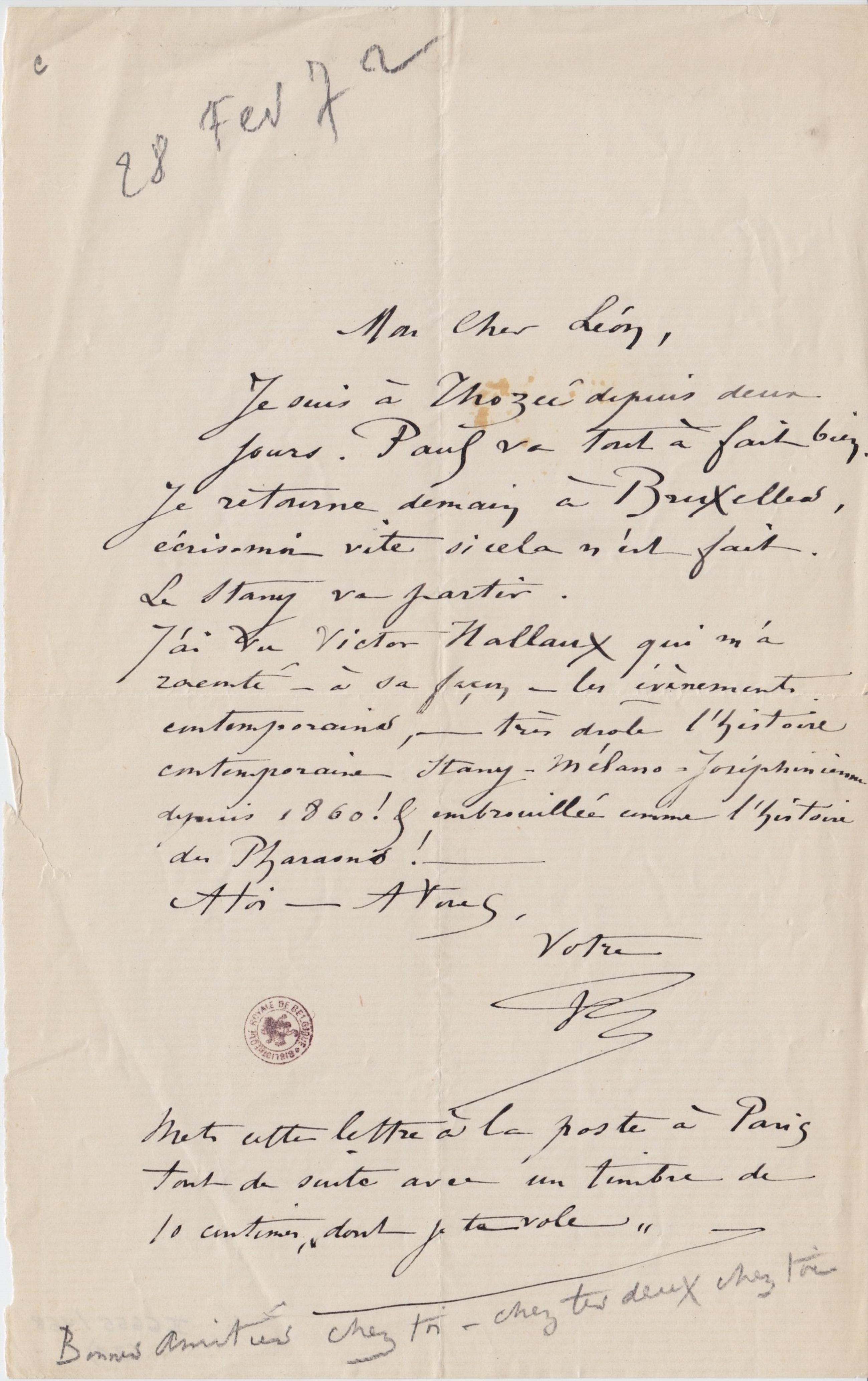 Je suis à Thozée depuis deux jours. Paul va tout à fait bien. Je retourne demain à Bruxelles, écris-moi vite si cela n’est fait. Le Stany va partir.