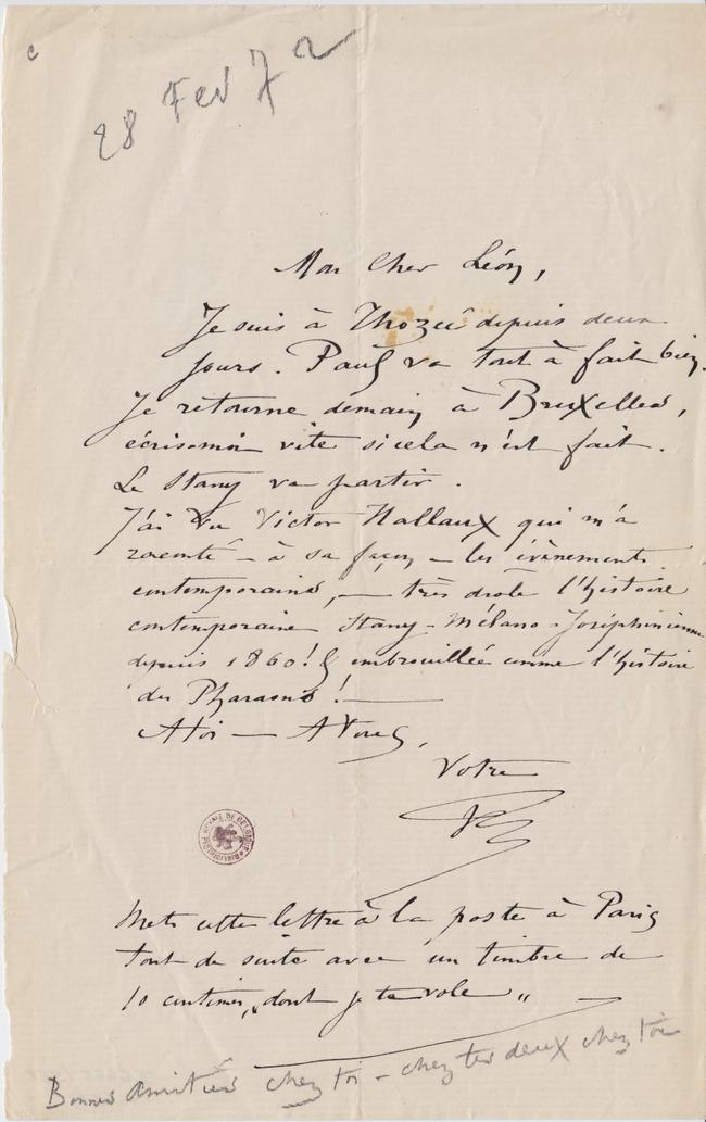 J’ai vu Victor Hallaux qui m’a raconté – à sa façon – les évènements contemporains, – très drôle l’histoire contemporaine Stany-Mélano-Joséphinienne depuis 1860 ! & embrouillée comme l’histoire des Pharaons ! –