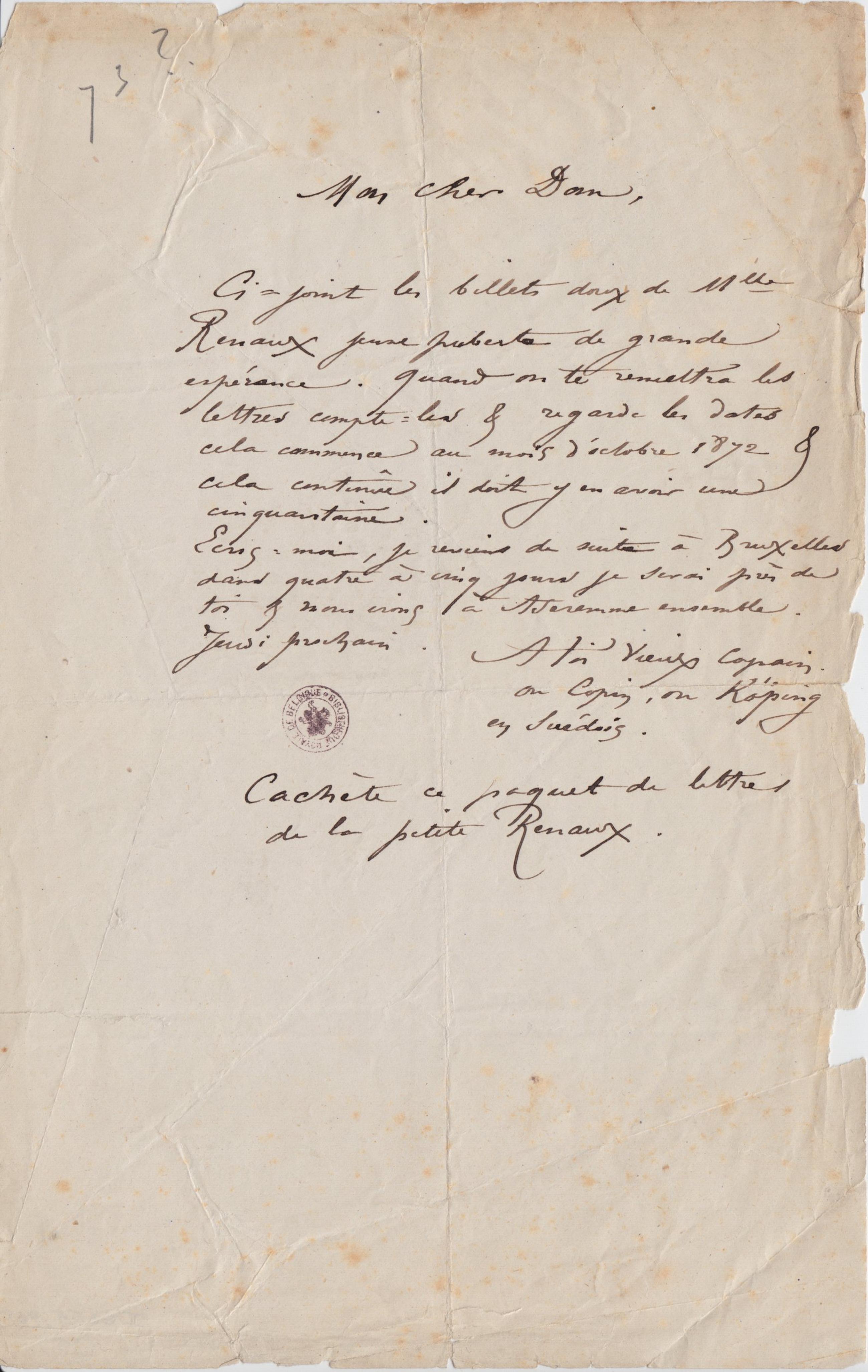 Ci-joint les billets doux de Mlle Renaux jeune puberte de grande espérance. Quand on te remettra les lettres compte-les & regarde les dates cela commence au mois d’octobre 1872 & cela continue il doit y en avoir une cinquantaine.