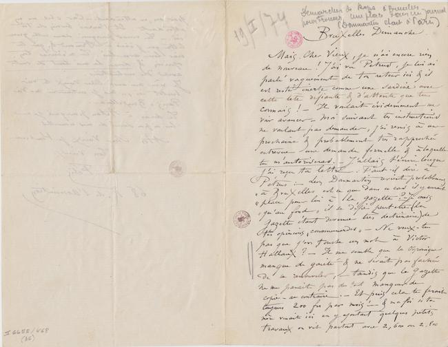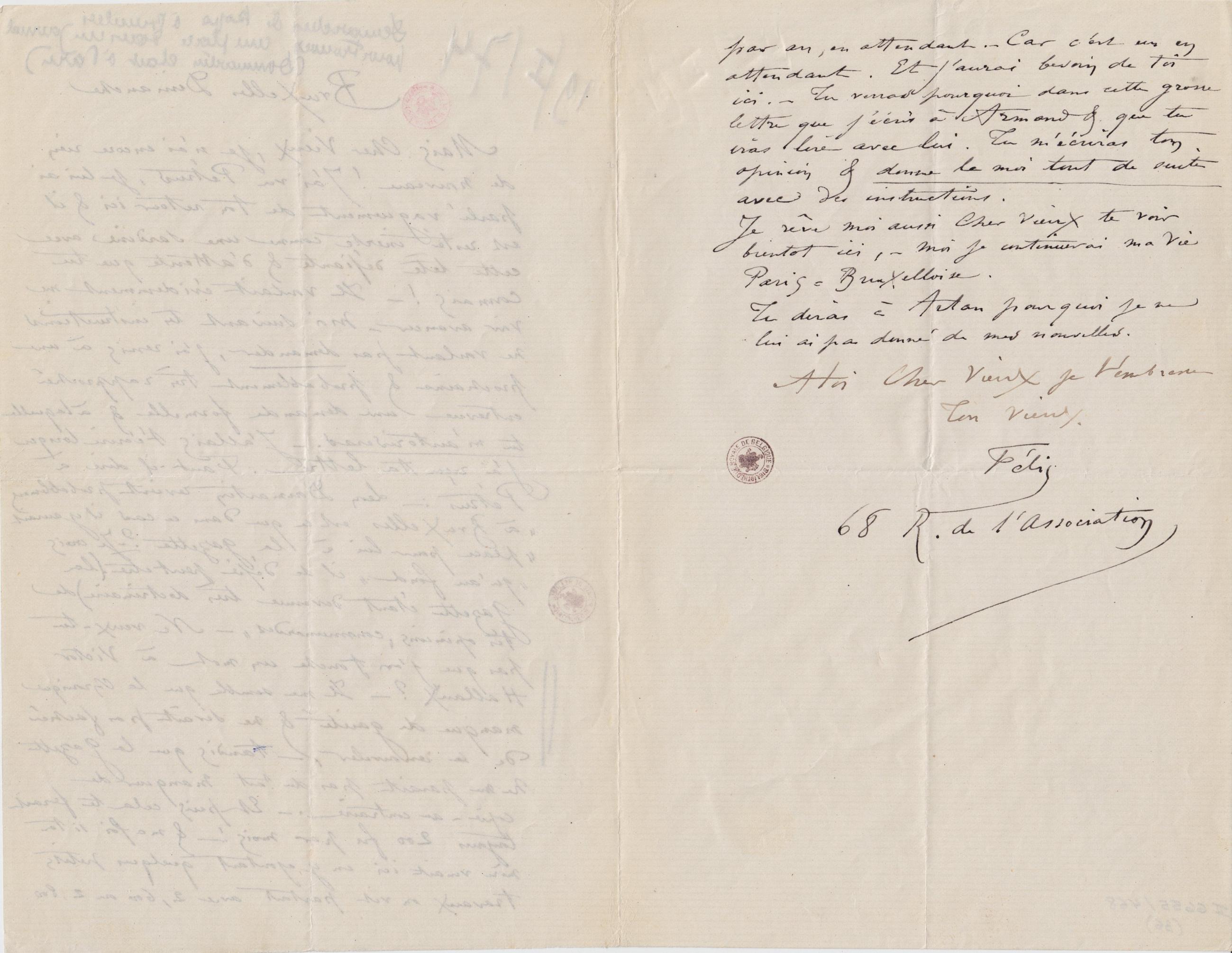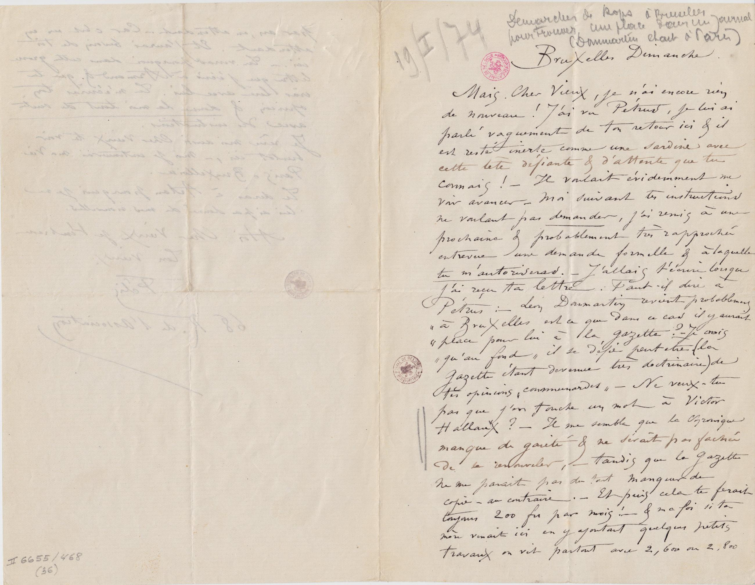 Mais. Cher Vieux, je n’ai encore rien de nouveau ! J’ai vu Pétrus, je lui ai parlé vaguement de ton retour ici & il est resté inerte comme une sardine avec cette tête défiante & d’attente que tu connais ! – Il voulait évidemment me voir avancer – Moi suivant tes instructions ne voulant pas demander, j’ai remis à une prochaine & probablement très rapprochée entrevue une demande formelle & à laquelle tu m’autoriseras. – J’allais t’écrire lorsque j’ai reçu ta lettre. Faut-il dire à Pétrus : – Léon Dommartin revient probablement « à Bruxelles est ce que dans ce cas il y aurait place pour lui à la Gazette ? – Je crois « qu’au fond » il se défie peut être (la Gazette étant devenue très doctrinaire) de tes opinions « communardes » – Ne veux-tu pas que j’en touche un mot à Victor Hallaux ? – Il me semble que la Chronique manque de gaieté & ne serait pas fachée de se renouveler, – tandis que la Gazette ne me parait pas du tout manquer de copie – au contraire. – Et puis cela te ferait toujours 200 frs par mois ! – & ma foi si ta mère venait ici en y ajoutant quelques petits travaux on vit partout avec 2,600 ou 2,800