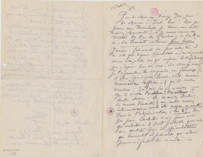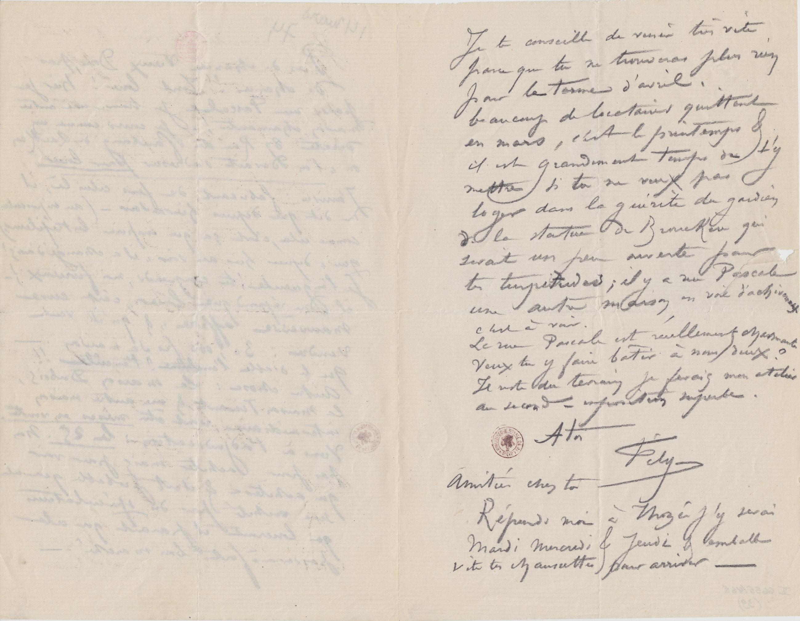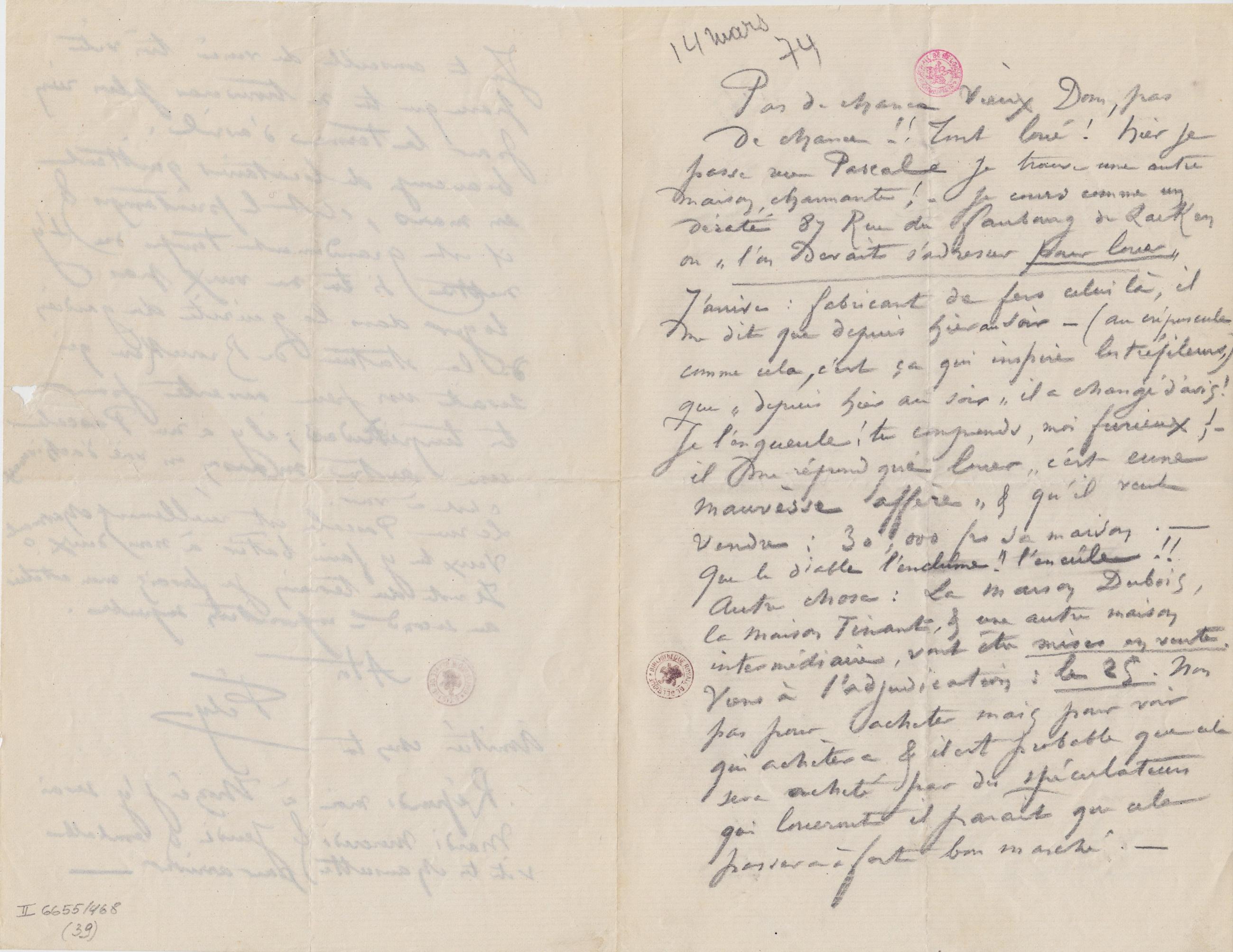Pas de chance Vieux Dom, pas de chance !! Tout loué ! hier je passe rue Pascale je trouve une autre maison, charmante ! – je cours comme un dératé 87 Rue du faubourg de Laeken où « l’on devait s’adresser pour louer » J’arrive : fabricant de fers celui là, il me dit que depuis hier au soir – (au crépuscule comme cela, c’est ça qui inspire les tréfileurs,) que « depuis hier au soir » il a changé d’avis ! Je l’engueule ! tu comprends, moi furieux ! – il me répond que louer « c’est eune mauvèsse affère » & qu’il veut vendre : 30,000 frs sa maison. – Que le diable l’enclume !! l’encule !! Autre chose : La maison Dubois, la maison Tinant, & une autre maison intermédiaire, vont être mises en vente. Viens à l’adjudication : le 25. Non pas pour acheter mais pour voir qui achètera & il est probable que cela sera acheté par des spéculateurs qui loueront il paraît que cela passera à fort bon marché. –