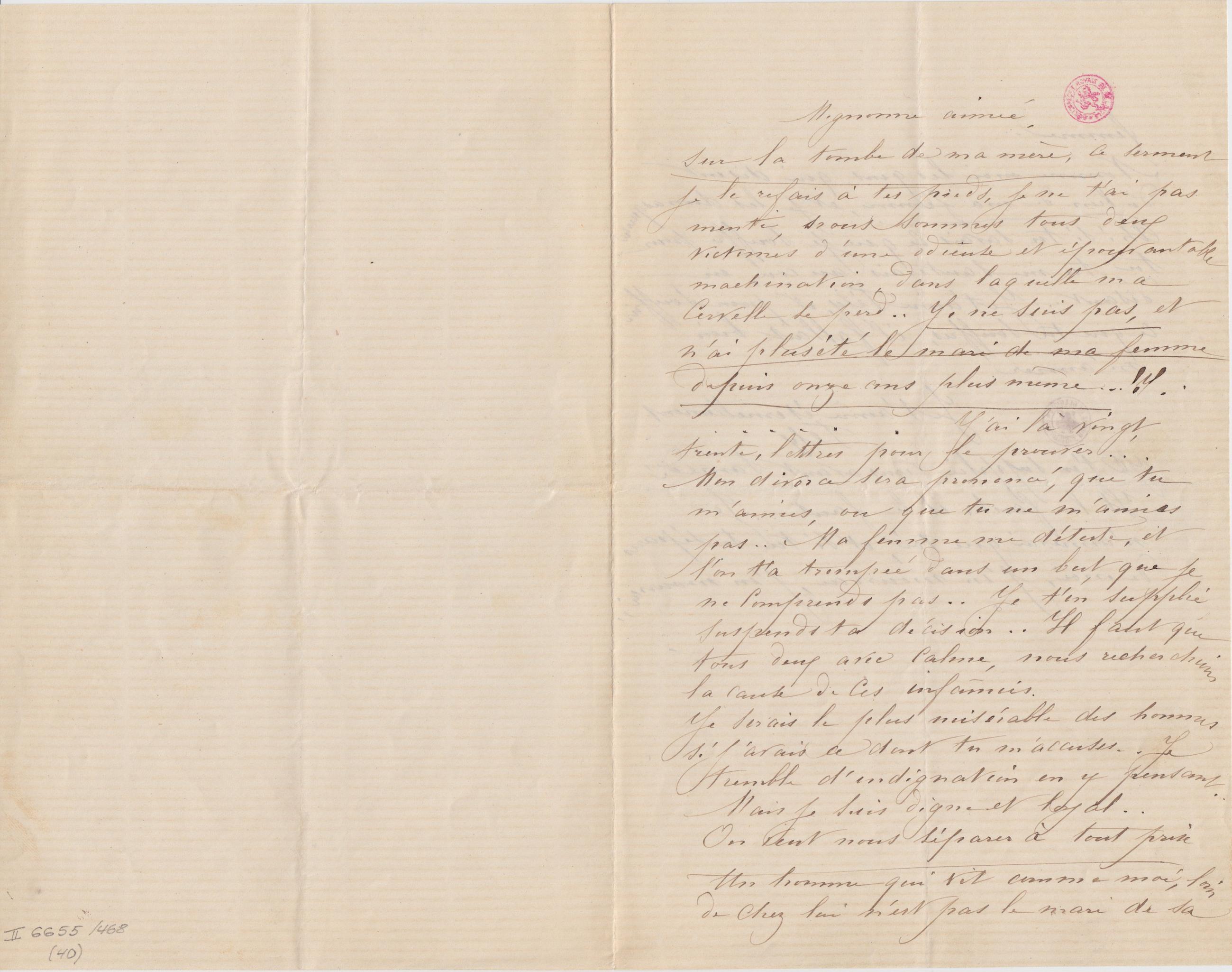 Sur la tombe de ma mère, ce serment je le refais à tes pieds, je ne t’ai pas menti, nous sommes tous deux victimes d’une odieuse et épouvantable machination, dans laquelle ma cervelle se perd.. Je ne suis pas, et n’ai plus été le mari de ma femme depuis onze ans plus même… !!........ J’ai là vingt, trente, lettres pour le prouver… Mon divorce sera prononcé, que tu m’aimes, ou que tu ne m’aimes pas.. Ma femme me déteste, et l’on t’a trompée dans un but, que je ne comprends pas.. Je t’en supplie suspends ta décision.. Il faut que tous deux avec calme, nous recherchions la cause de ces infâmies.