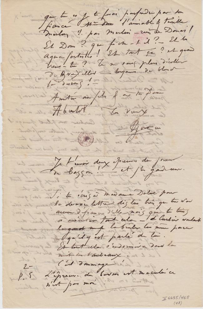 Si tu écris à Madame Duluc pour la dernière lettre dis lui bien que tu n’as aucune défiance d’elle mais que tu tiens à anéantir tout cela – Curbier voulait la gard ne p la brûler lui même parce qu’il y est parlé de lui.