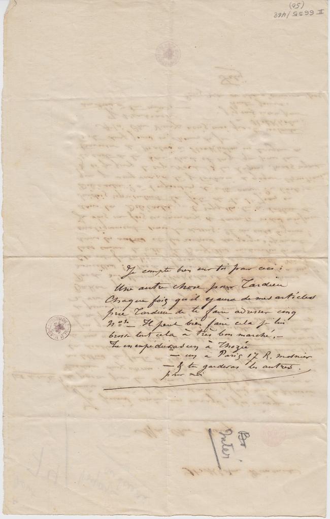 Chaque fois qu’il y aura de mes articles prie Tardieu de te faire adresser cinq nos. – Il peut bien faire cela je lui brosse tout cela à très bon marché. –