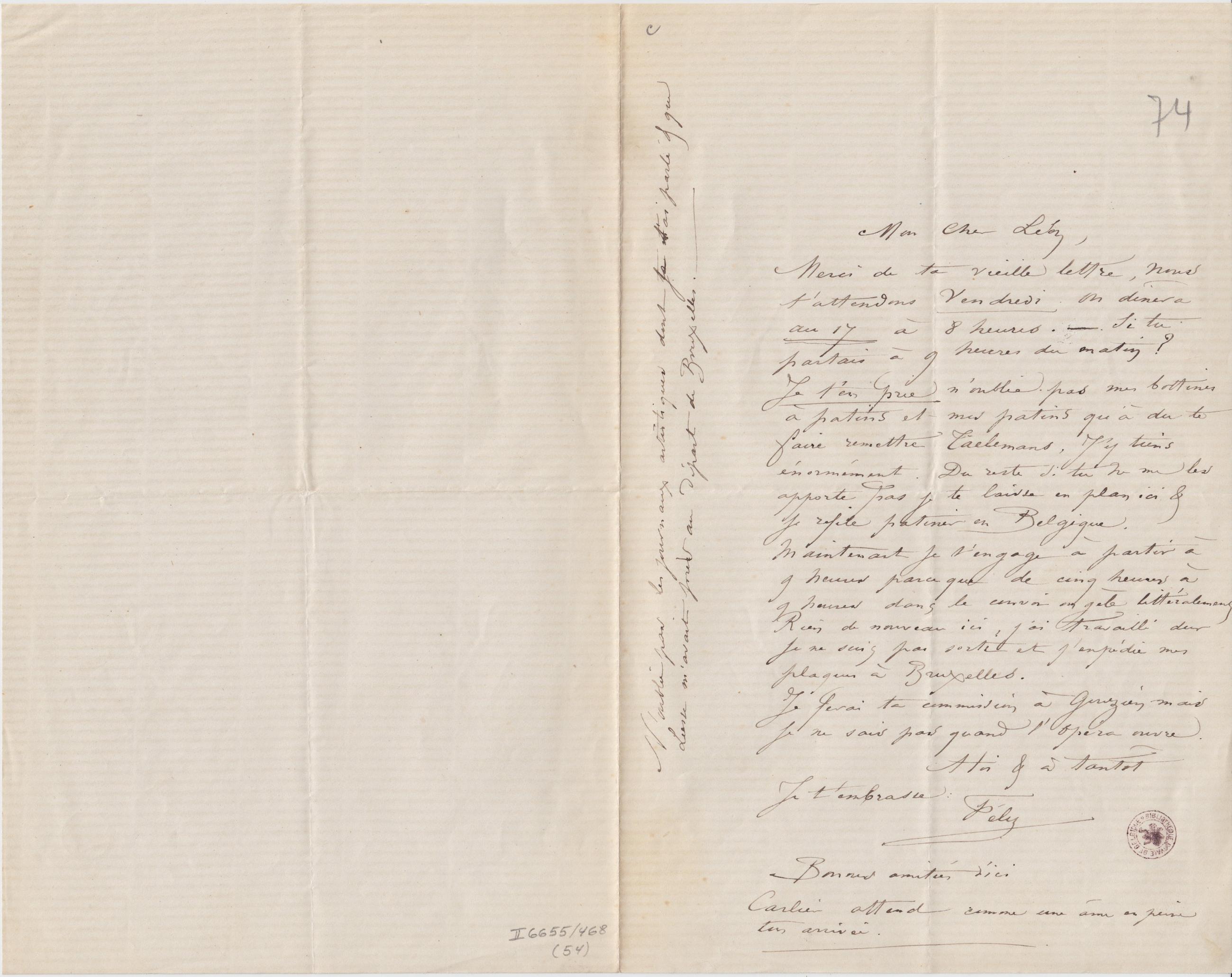 Merci de ta vieille lettre, nous t’attendons Vendredi. On dînera au 17 à 8 heures. – Si tu partais à 9 heures du matin ?