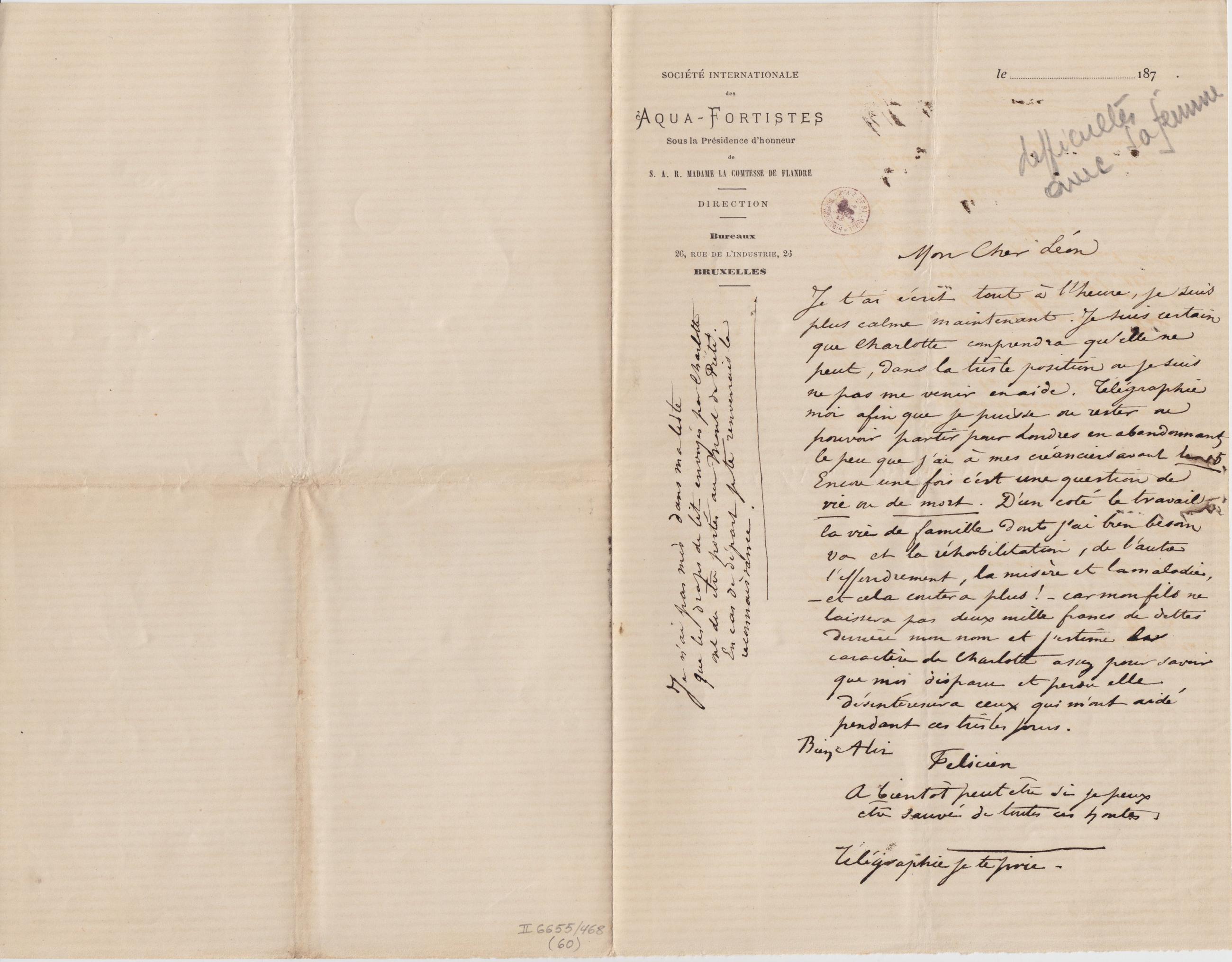 Je t’ai écrit tout à l’heure, je suis plus calme maintenant. Je suis certain que Charlotte comprendra qu’elle ne peut, dans la triste position où je suis ne pas me venir en aide. Télégraphie moi afin que je puisse ou rester ou pouvoir partir pour Londres en abandonnant le peu que j’ai à mes créanciers avant le 15. Encore une fois c’est une question de vie ou de mort. D’un coté le travail – la vie de famille dont j’ai bien besoin va et la réhabilitation, de l’autre l’effondrement, la misère et la maladie, – et cela coutera plus ! – car mon fils ne laissera pas deux mille francs de dettes derrière mon nom et j’estime le caractère de Charlotte assez pour savoir que moi disparu et perdu elle désintéressera ceux qui m’ont aidé pendant ces tristes jours.