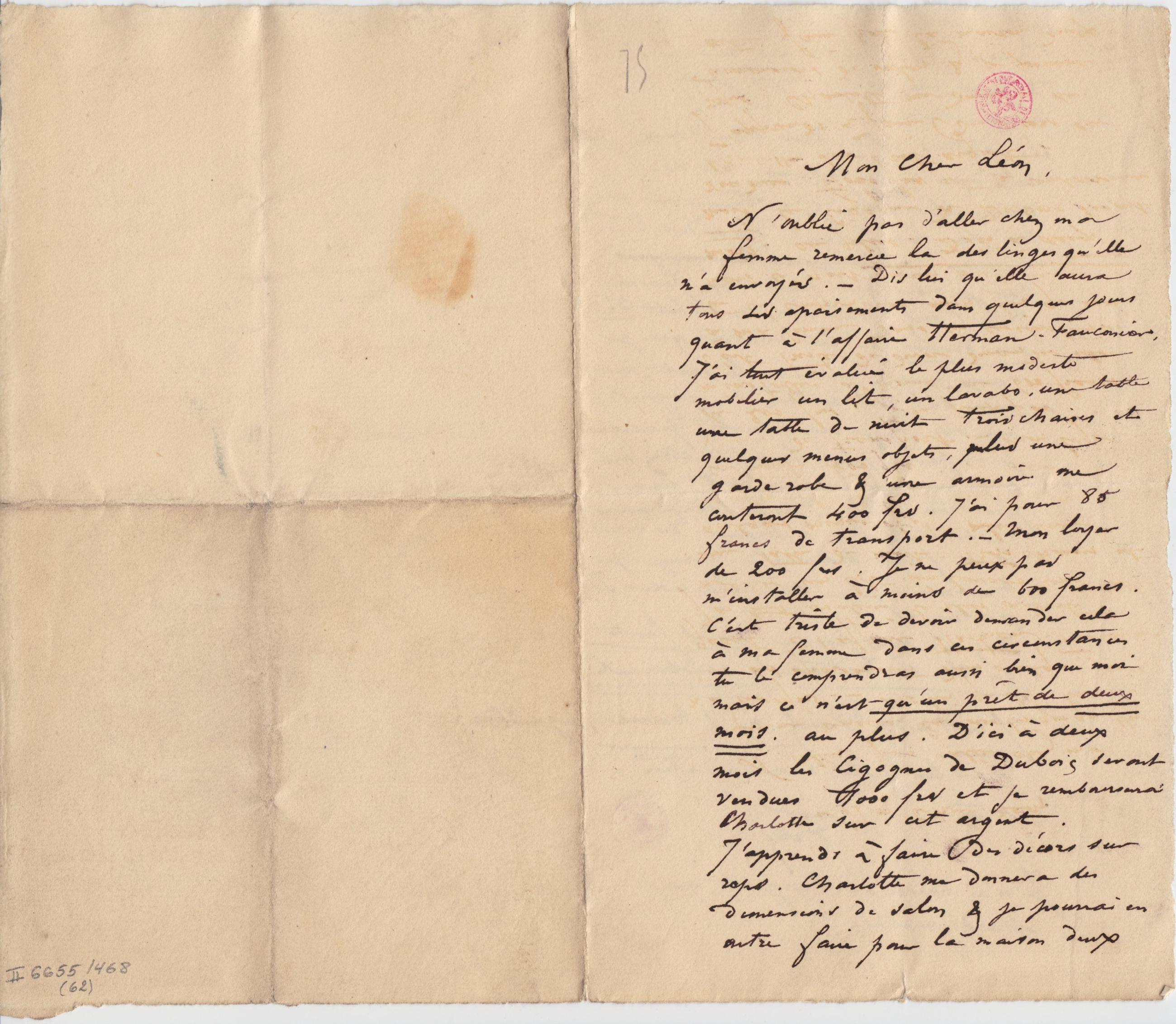 N’oublie pas d’aller chez ma femme remercie la des linges qu’elle m’a envoyés. – Dis lui qu’elle aura tous ses apaisements dans quelques jours quant à l’affaire Herman-Fauconier. J’ai tout évalué le plus modeste mobilier un lit, un lavabo, une table une table de nuit trois chaises et quelques menus objets, plus une garde robe & une armoire me couteront 400 frs. J’ai pour 85 francs de transport. – Mon loyer de 200 frs. Je ne peux pas m’installer à moins de 600 francs. C’est triste de devoir demander cela à ma femme dans ces circonstances tu le comprendras aussi bien que moi mais ce n’est qu’un prêt dedeux mois. au plus. D’ici à deux mois les Cigognes de Dubois seront vendues 1000 frs et je rembourserai Charlotte sur cet argent.