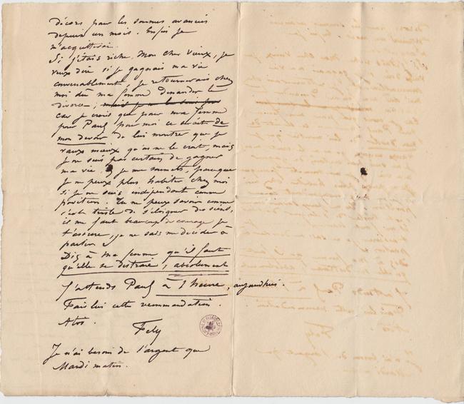 Si j’étais riche, Mon Cher Vieux, je veux dire si je gagnais ma vie convenablement, je retournerais chez moi dû ma femme demander le divorce ; mais je ne le suis pas car je crois que pour ma femme pour Paul pour moi ce serait de mon devoir de lui montrer que je vaux mieux qu’on ne le croit, mais je ne suis pas certain de gagner ma vie, & je me soumets, parce que je ne peux plus habiter chez moi si je ne suis indépendant comme position. Tu ne peux savoir comme c’est triste de s’éloigner des siens, il me faut beaucoup de courage je t’assure, je ne sais me décider à partir